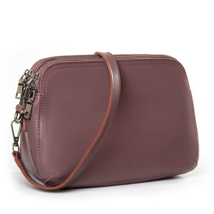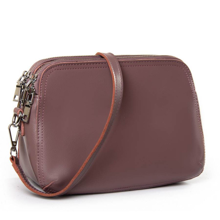 Жіноча сумочка-клатч. Виготовлена з натуральної м'якої шкіри. Три відділення, закриваються на блискавці. Усередині центрального відділення знаходиться подвійна відкрита кишеня і кишеня на блискавці. На зворотному боці є кишеня на блискавці. У комплекті регульований плечовий ремінь і знімна ручка.
