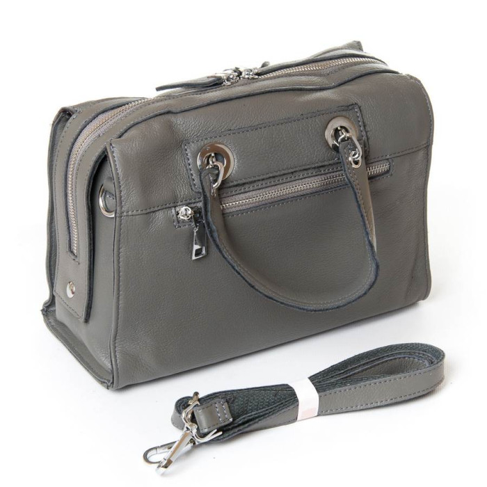 Жіноча сумка. Виготовлена із натуральної м'якої шкіри. Закривається на блискавку. Усередині знаходиться подвійне відділення, розділене кишенею-перегородкою на блискавці, відкрита кишеня та бічна кишеня на блискавці. На звороті сумки є кишеня на блискавці. У комплекті регульований плечовий ремінь.