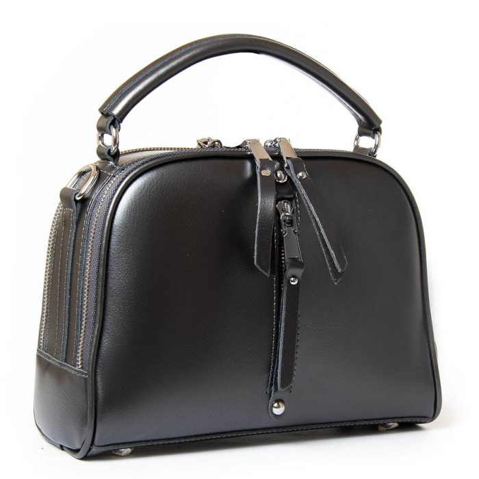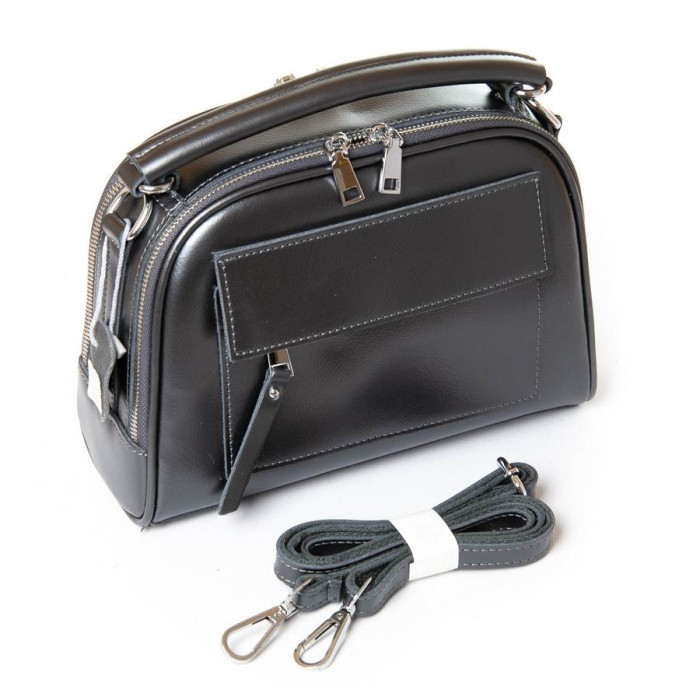 Жіноча шкіряна сумочка. Виготовлена із щільної натуральної шкіри. Одне відділення, закривається на блискавку. Усередині знаходиться подвійне відділення, розділене кишенею-перегородкою на блискавці, відкрита кишеня та кишеня на блискавці. На фасаді та зворотному боці знаходяться кишені на блискавці. У комплекті регульований плечовий ремінь.