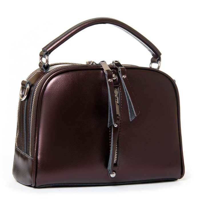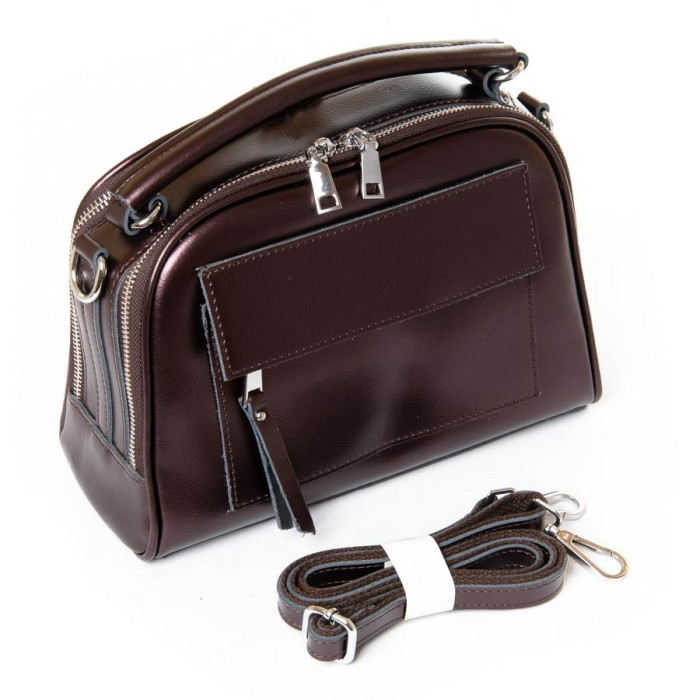 Жіноча шкіряна сумочка. Виготовлена із щільної натуральної шкіри. Одне відділення, закривається на блискавку. Усередині знаходиться подвійне відділення, розділене кишенею-перегородкою на блискавці, відкрита кишеня та кишеня на блискавці. На фасаді та зворотному боці знаходяться кишені на блискавці. У комплекті регульований плечовий ремінь.