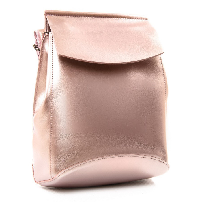 Жіночий шкіряний рюкзак. Виготовлений із натуральної щільної шкіри. Можна носити на плечі на регульованому ремені. Під клапаном додатково закривається на блискавку. Усередині знаходиться основне і додаткове відділення, розділене кишенею-перегородкою на блискавці, відкрита кишеня і кишеня на блискавці. Зовні рюкзака на зворотному боці розташована кишеня на блискавці. Плечові лямки регулюються за довжиною.