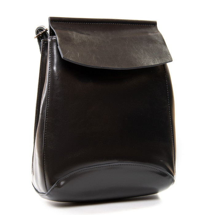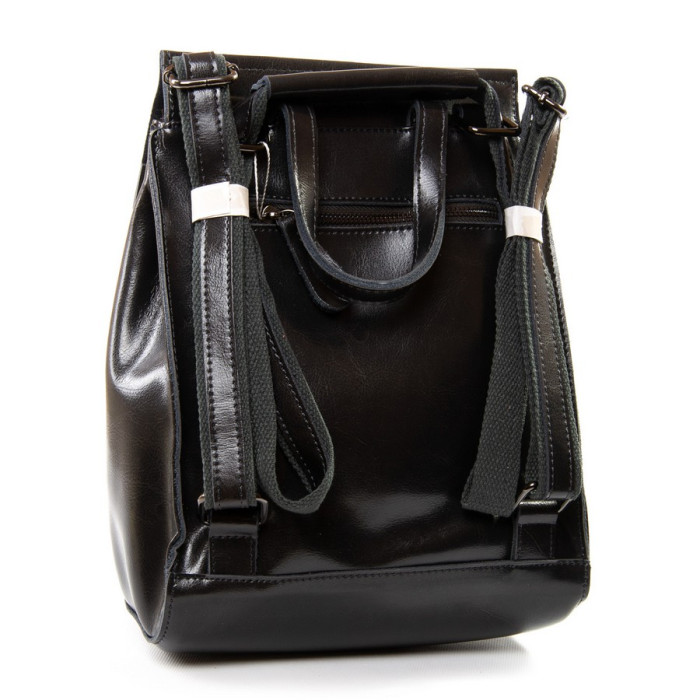 Жіночий шкіряний рюкзак. Виготовлений із натуральної щільної шкіри. Можна носити на плечі на регульованому ремені. Під клапаном додатково закривається на блискавку. Усередині знаходиться основне і додаткове відділення, розділене кишенею-перегородкою на блискавці, відкрита кишеня і кишеня на блискавці. Зовні рюкзака на зворотному боці розташована кишеня на блискавці. Плечові лямки регулюються за довжиною.