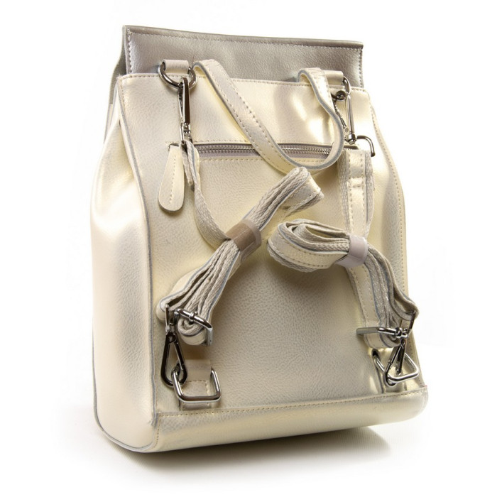 Жіночий шкіряний рюкзак. Виготовлений із натуральної щільної шкіри. Можна носити на плечі на регульованому ремені. Під клапаном додатково закривається на блискавку. Усередині знаходиться основне і додаткове відділення, розділене кишенею-перегородкою на блискавці, відкрита кишеня і кишеня на блискавці. Зовні рюкзака на зворотному боці розташована кишеня на блискавці. Плечові лямки регулюються за довжиною.