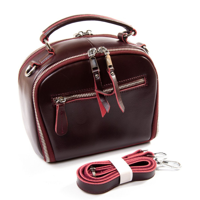 Женская сумочка-клатч. Изготовлена из натуральной плотной кожи. Два отделения, закрываются на молнии. Внутри находится открытый карман и карман на молнии. На обратной стороне є карман на молнии. В комплекте регулируемый плечевой ремень.