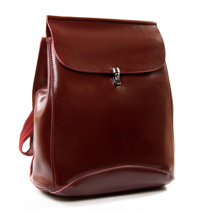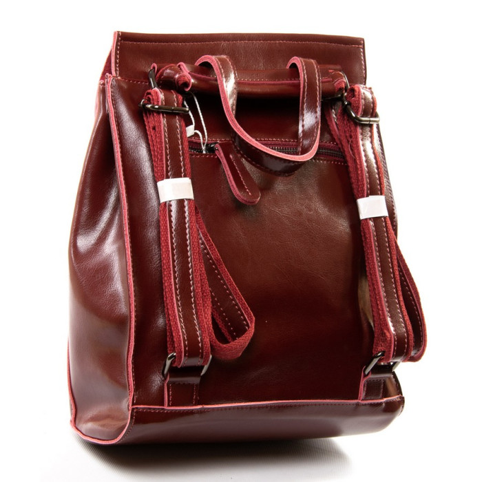 Жіночий шкіряний рюкзак. Виготовлений із натуральної щільної шкіри. Можна носити на плечі на регульованому ремені. Під клапаном додатково закривається на блискавку. Усередині знаходиться основне і додаткове відділення, розділене кишенею-перегородкою на блискавці, відкрита кишеня і кишеня на блискавці. Зовні рюкзака на зворотному боці розташована кишеня на блискавці. Плечові лямки регулюються за довжиною.