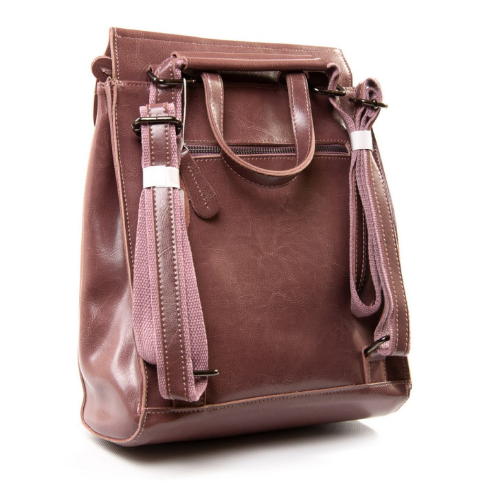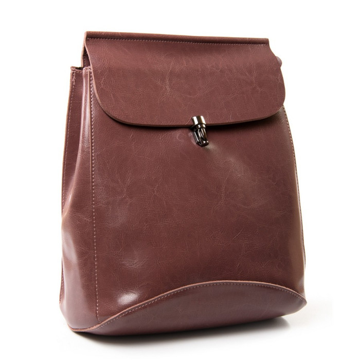 Жіночий шкіряний рюкзак. Виготовлений із натуральної щільної шкіри. Можна носити на плечі на регульованому ремені. Під клапаном додатково закривається на блискавку. Усередині знаходиться основне і додаткове відділення, розділене кишенею-перегородкою на блискавці, відкрита кишеня і кишеня на блискавці. Зовні рюкзака на зворотному боці розташована кишеня на блискавці. Плечові лямки регулюються за довжиною.
