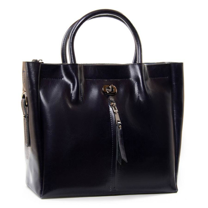 Жіноча сумка. Виготовлена з натуральної шкіри. Закривається на блискавку. Усередині знаходиться подвійне відділення, розділене кишенею-перегородкою на блискавці, подвійна відкрита кишеня і кишеня на блискавці на внутрішніх стінках сумки. На зворотному та лицьовому боці є кишені на блискавці. Сумка має жорстке дно. У комплекті регульований плечовий ремінь.