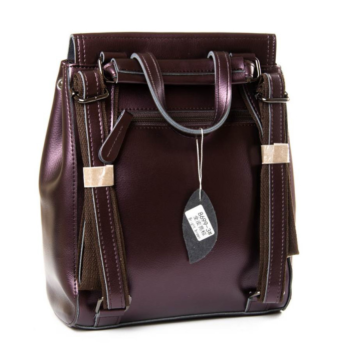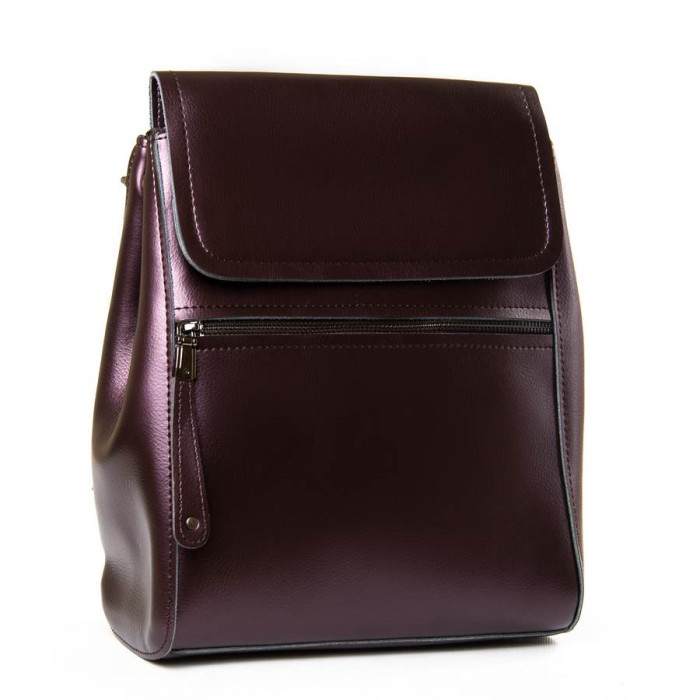 Жіночий шкіряний рюкзак. Виготовлений з натуральної щільної шкіри. Можна носити на плечі на регульованому ремені. Під клапаном додатково закривається на блискавку. Усередині знаходиться основне і додаткове відділення, розділене кишенею-перегородкою на блискавці, подвійна відкрита кишеня і кишеня на блискавці. Зовні рюкзака на лицьовій і тильній стороні розташовані кишені на блискавці. Плечові лямки регулюються за довжиною.