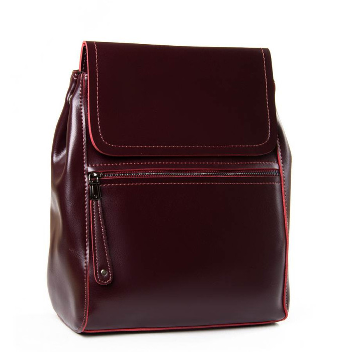 Жіночий шкіряний рюкзак. Виготовлений з натуральної щільної шкіри. Можна носити на плечі на регульованому ремені. Під клапаном додатково закривається на блискавку. Усередині знаходиться основне і додаткове відділення, розділене кишенею-перегородкою на блискавці, подвійна відкрита кишеня і кишеня на блискавці. Зовні рюкзака на лицьовій і тильній стороні розташовані кишені на блискавці. Плечові лямки регулюються за довжиною.