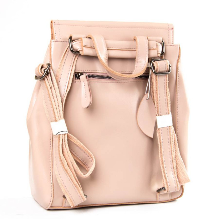 Жіночий шкіряний рюкзак. Виготовлений з натуральної щільної шкіри. Можна носити на плечі на регульованому ремені. Під клапаном додатково закривається на блискавку. Усередині знаходиться основне і додаткове відділення, розділене кишенею-перегородкою на блискавці, подвійна відкрита кишеня і кишеня на блискавці. Зовні рюкзака на лицьовій і тильній стороні розташовані кишені на блискавці. Плечові лямки регулюються за довжиною.