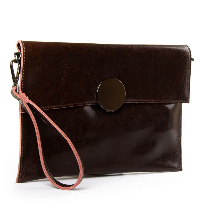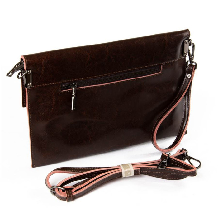 Жіноча сумка-клатч. Виготовлена з натуральної щільної шкіри. Закривається на замок. Усередині знаходиться подвійне відділення, розділене кишенею-перегородкою на блискавці, відкрита кишеня і кишеня на блискавці на внутрішніх стінках сумки. На зворотному боці розташована кишеня на блискавці. У комплекті ремінець для кисті та регульований плечовий ремінь.