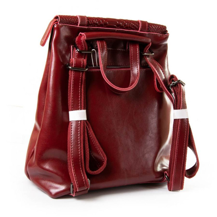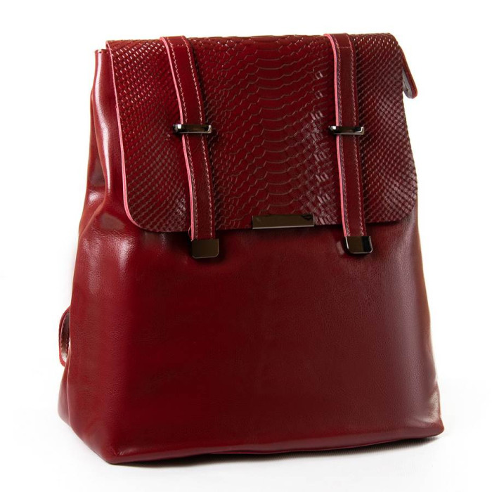 Жіночий шкіряний рюкзак. Виготовлений з натуральної щільної шкіри. Можна носити на плечі на ремені, що регулюється. Під клапаном додатково закривається на блискавку. Усередині знаходиться подвійне відділення, розділене кишенею-перегородкою на блискавці, подвійна відкрита кишеня та кишеня на блискавці. Зовні рюкзака на звороті розташована кишеня на блискавці. Плечові лямки регулюються по довжині.