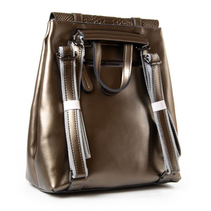 Жіночий шкіряний рюкзак. Виготовлений з натуральної щільної шкіри. Можна носити на плечі на ремені, що регулюється. Під клапаном додатково закривається на блискавку. Усередині знаходиться подвійне відділення, розділене кишенею-перегородкою на блискавці, подвійна відкрита кишеня та кишеня на блискавці. Зовні рюкзака на звороті розташована кишеня на блискавці. Плечові лямки регулюються по довжині.