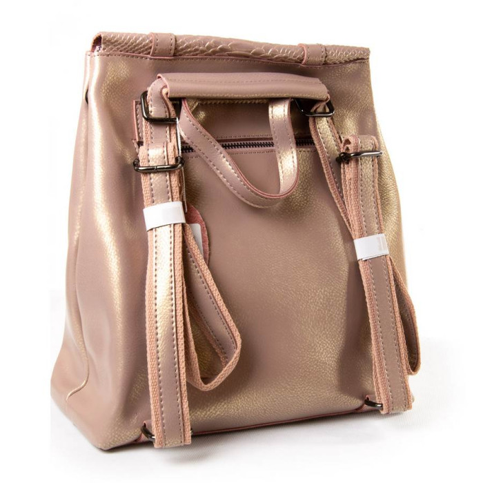 Жіночий шкіряний рюкзак. Виготовлений з натуральної щільної шкіри. Можна носити на плечі на ремені, що регулюється. Під клапаном додатково закривається на блискавку. Усередині знаходиться подвійне відділення, розділене кишенею-перегородкою на блискавці, подвійна відкрита кишеня та кишеня на блискавці. Зовні рюкзака на звороті розташована кишеня на блискавці. Плечові лямки регулюються по довжині.