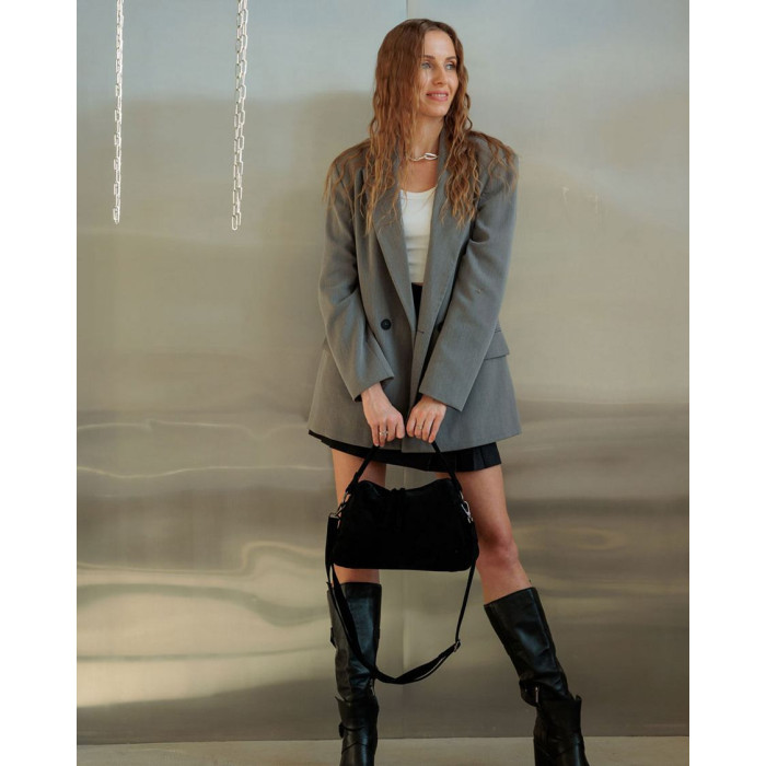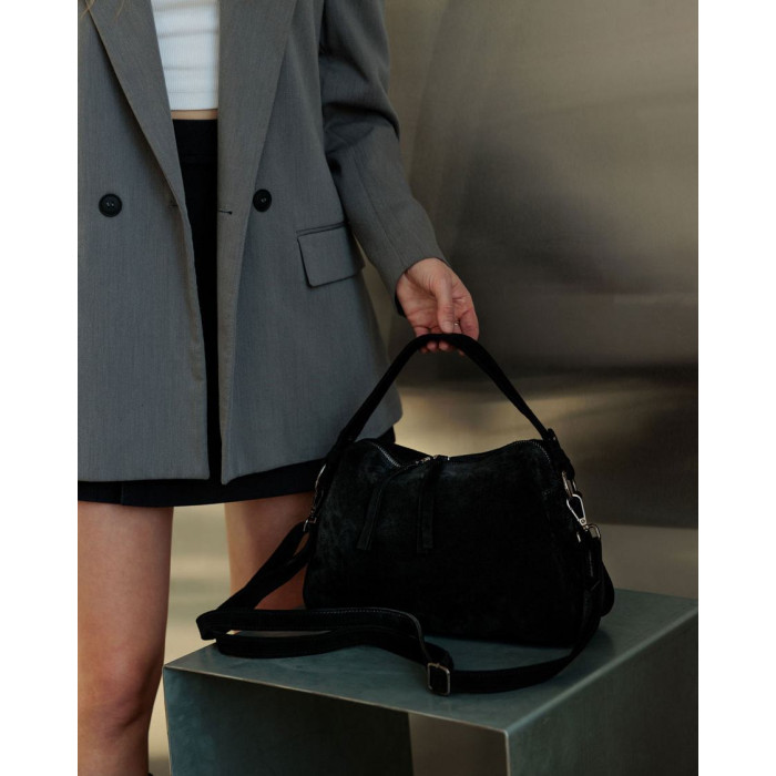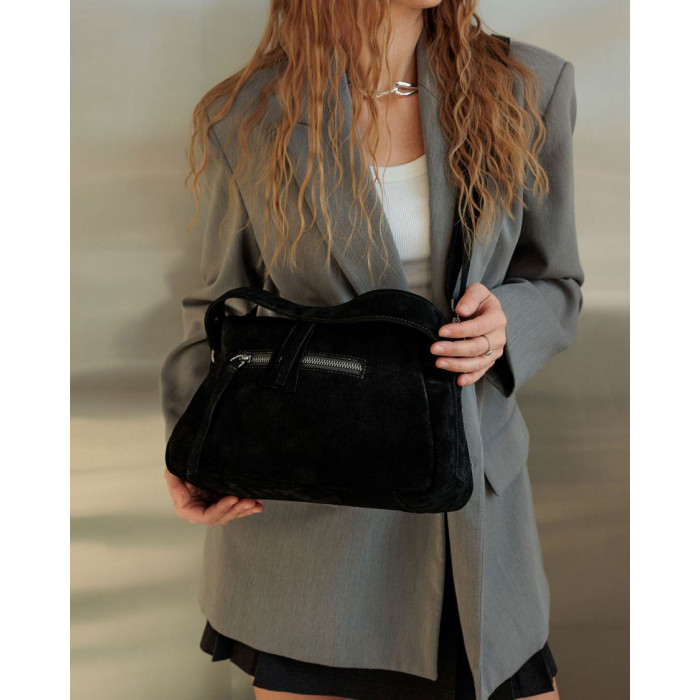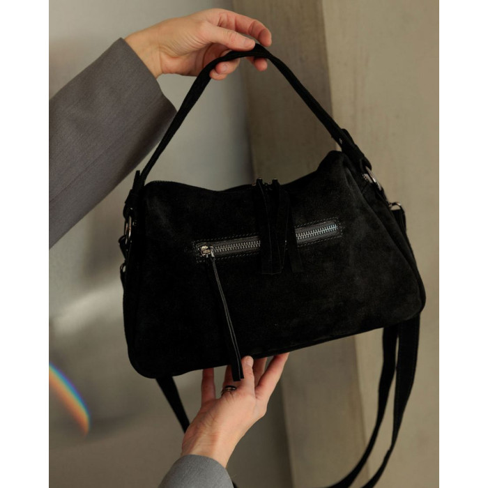Жіноча сумка K1204, колір чорний, в наявності на оптовому складі 7 км, матеріал сумки натуральна шкіра, замша. Сумка відкривається за допомогою блискавки. Усередині сумка має одну відкриту кишеню та кишеню на блискавці. Зовні є кишеня для дрібних предметів. Сумка має довгий ремінь 110 см і ручку 12 см (від верху сумки).