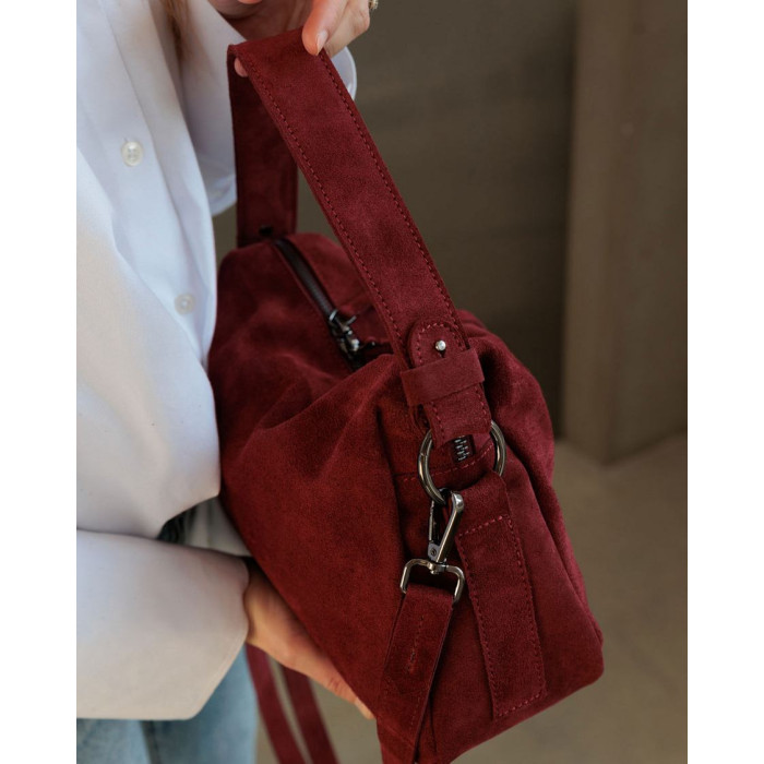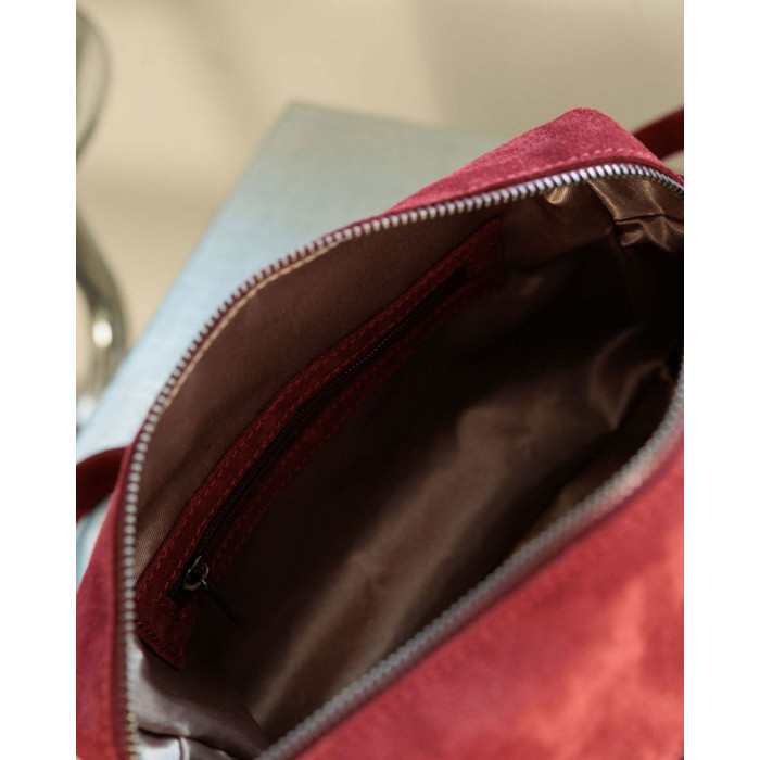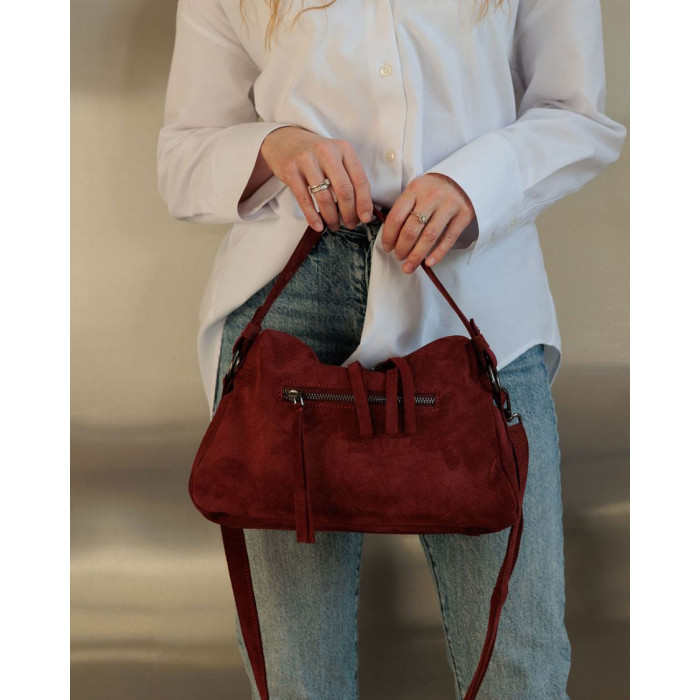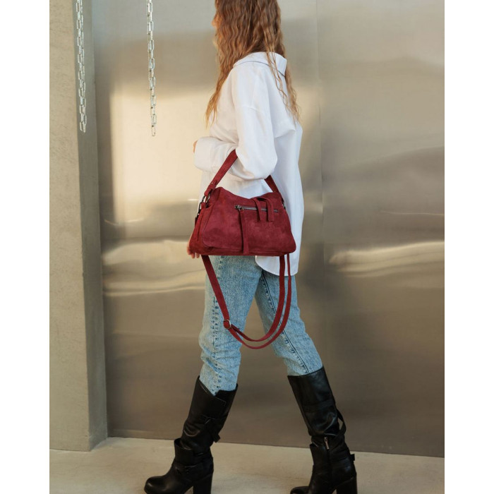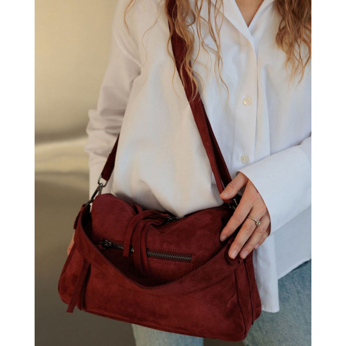 Жіноча стильна сумка K1207, Україна, в наявності оптом і в роздріб зі складу 7 км в Одесі, матеріал сумки натуральна шкіра, замша. Сумка відкривається за допомогою блискавки. Усередині сумка має одну відкриту кишеню та кишеню на блискавці. Зовні є кишеня для дрібних предметів. Сумка має довгий ремінь 110 см і ручку 12 см (від верху сумки).