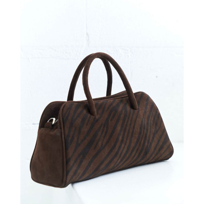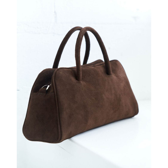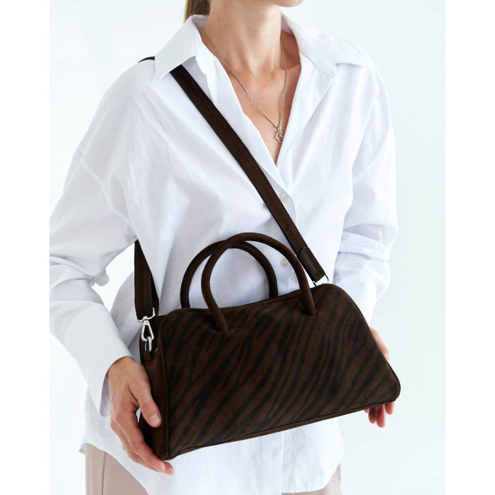 Жіноча сумка K73155, колір шоколадний, матеріал сумки натуральна шкіра, замша. Сумка відкривається за допомогою блискавки. Усередині сумка має одну відкриту кишеню та кишеню на блискавці.