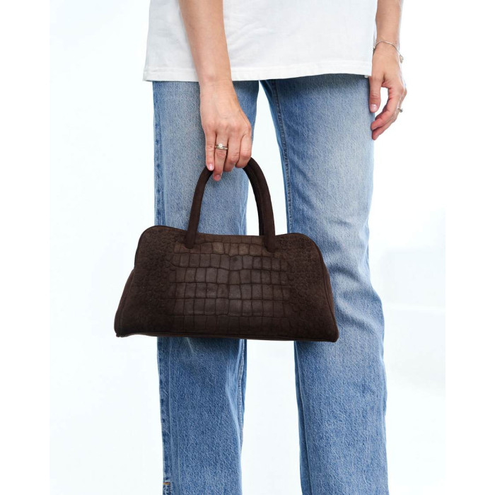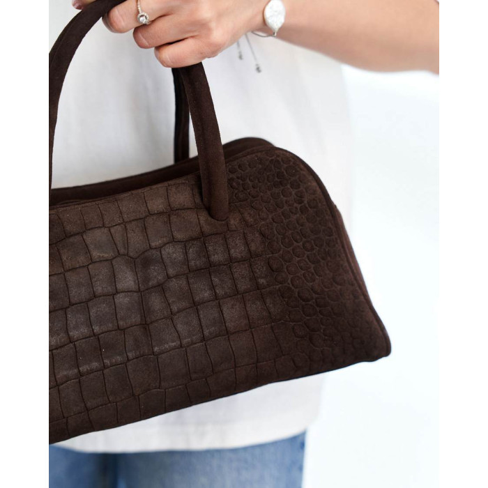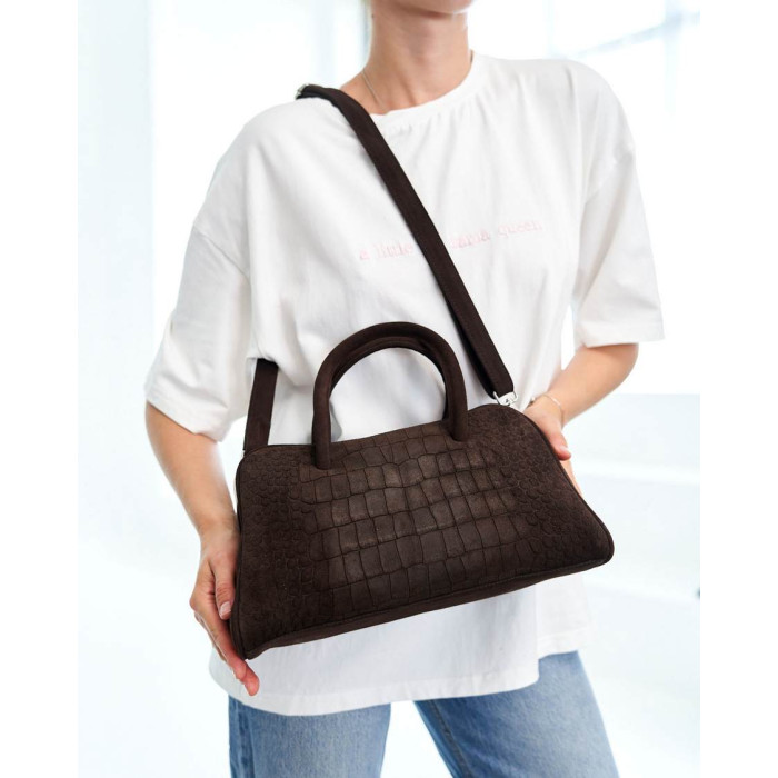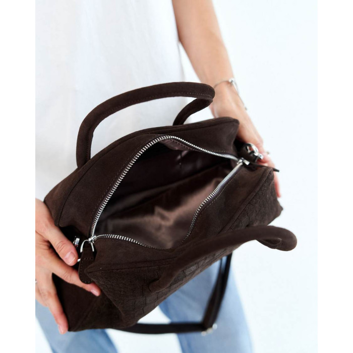 Жіноча сумка K73165, колір шоколадний, матеріал сумки натуральна шкіра, замша. Сумка відкривається за допомогою блискавки. Усередині сумка має одну відкриту кишеню та кишеню на блискавці.