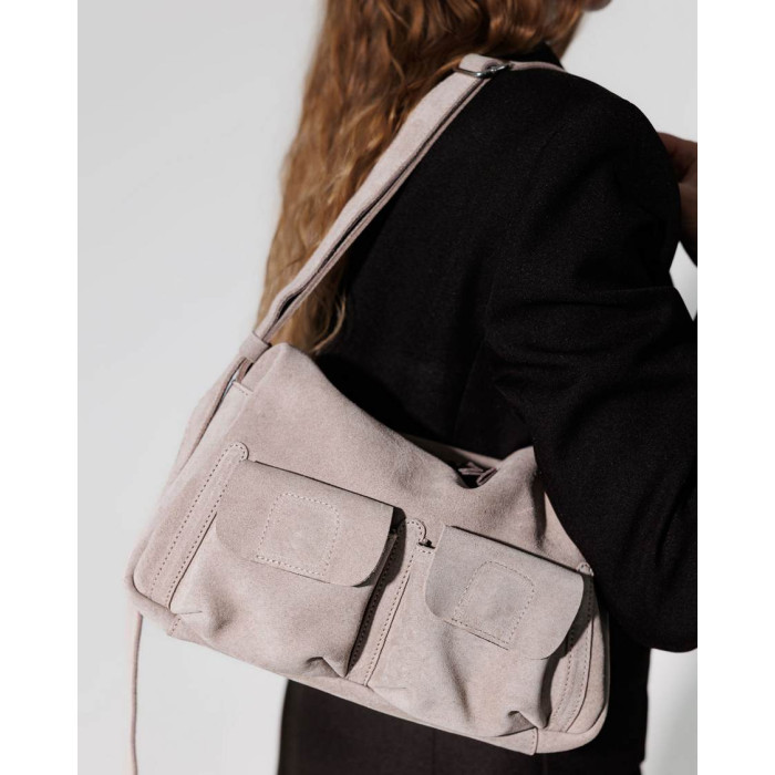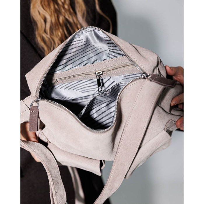 Жіноча сумка K72859, колір бежевий,матеріал сумки натуральна шкіра, замша. Сумка відкривається за допомогою блискавки. Усередині сумка має одну відкриту кишеню та кишеню на блискавці. Зовні є 3 кишені для дрібних предметів. Сумка має довгий ремінь 110 см