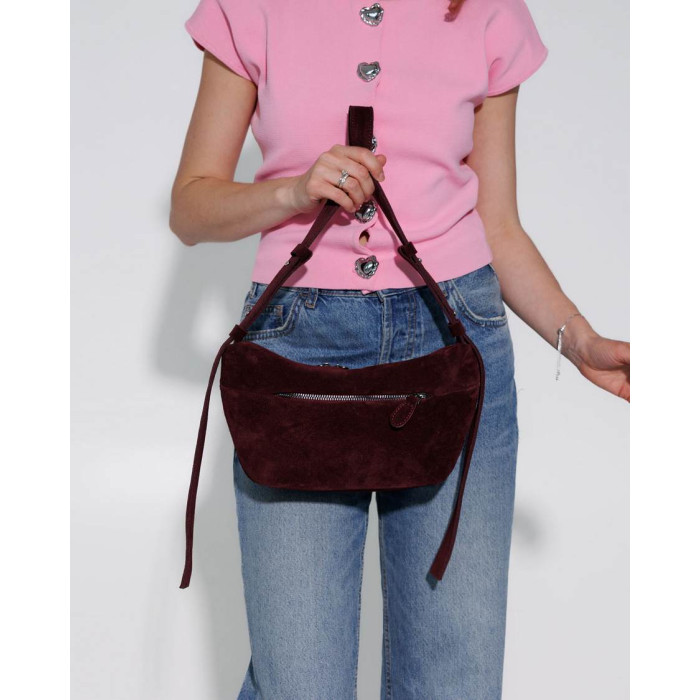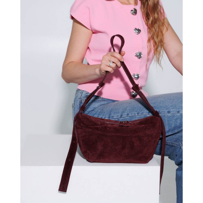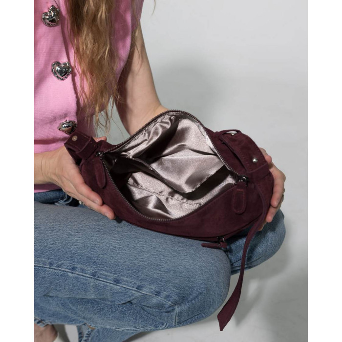 Жіноча сумка K72457, колір бордовий, матеріал сумки натуральна шкіра, замша. Сумка відкривається за допомогою блискавки. Усередині сумка має одну відкриту кишеню та кишеню на блискавці. Зовні є кишеня для дрібних предметів. Сумка має довгий ремінь 100 см.