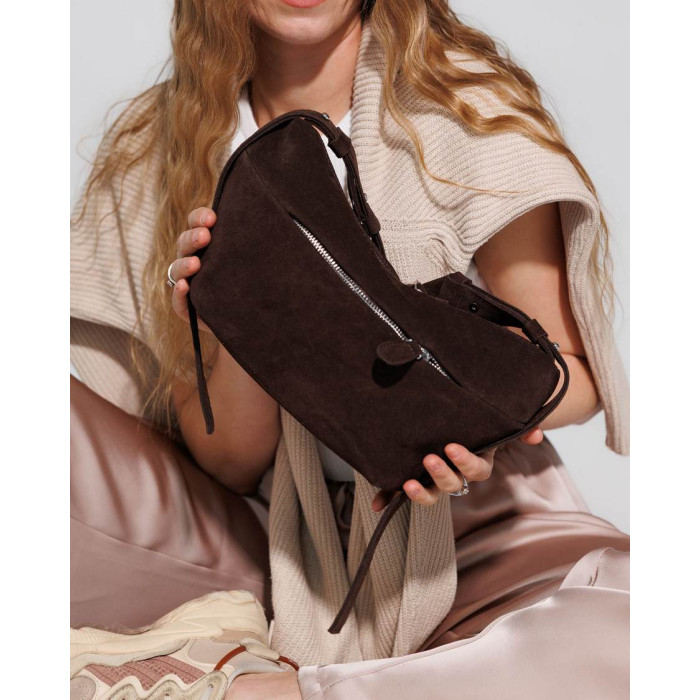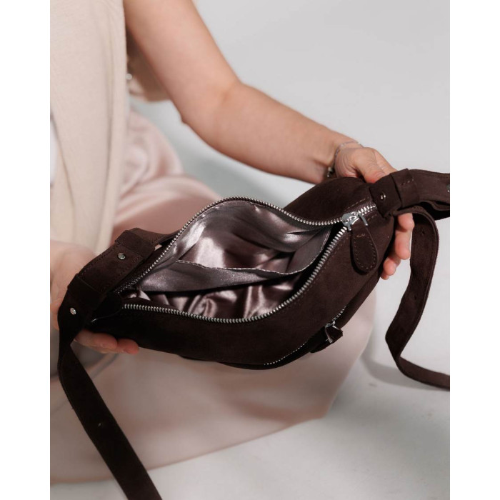 Жіноча сумка K72455, колір шоколаднний, матеріал сумки натуральна шкіра, замша. Сумка відкривається за допомогою блискавки. Усередині сумка має одну відкриту кишеню та кишеню на блискавці. Зовні є кишеня для дрібних предметів. Сумка має довгий ремінь 100 см.