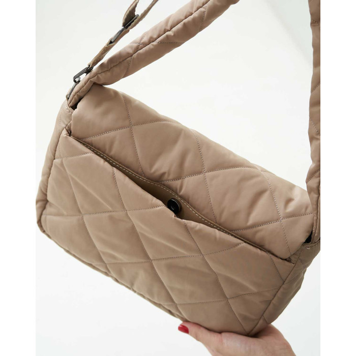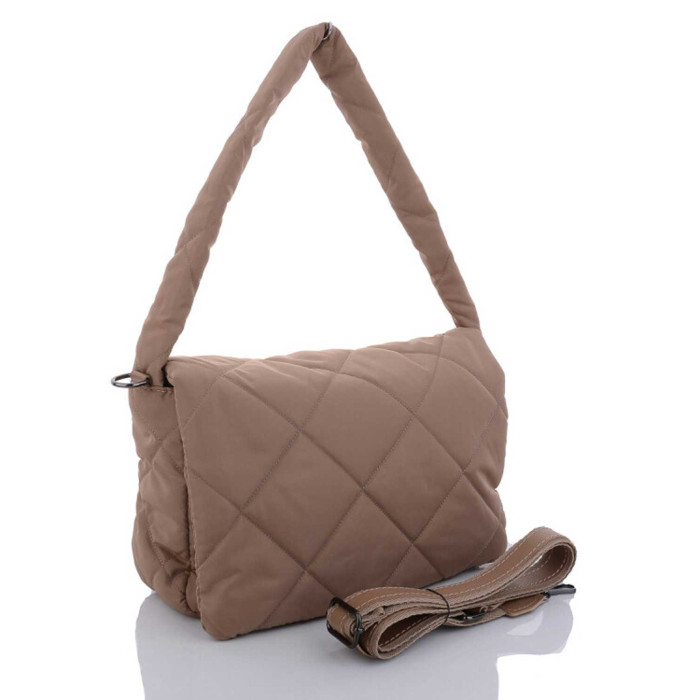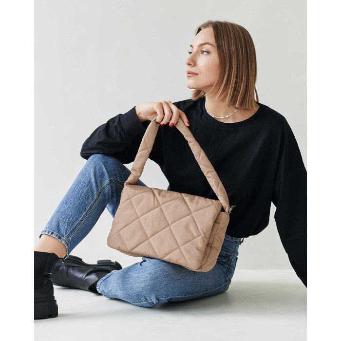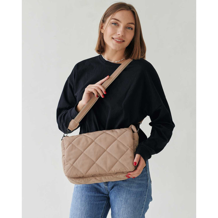 Жіноча нейлонова стьобана сумка 67419 від виробника «Welassie» Україна, колір бежевий, матеріал сумки нейлон. Сумка відкривається за допомогою магніту та застібки-блискавки. Усередині сумка на щільній підкладці і має дві кишені: на застібці та відкриту. Додатково є кишеня на магніті для маленьких предметів. У комплекті є два ремені: вшитий висотою 26 см., (за допомогою якого зручно носити сумку в руці, на згині ліктя) та довгий плечовий ремінь, довжиною 140 см., (за допомогою якого зручно носити через плече).