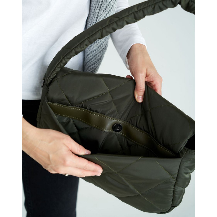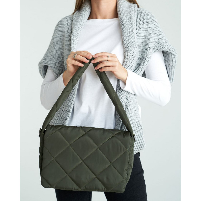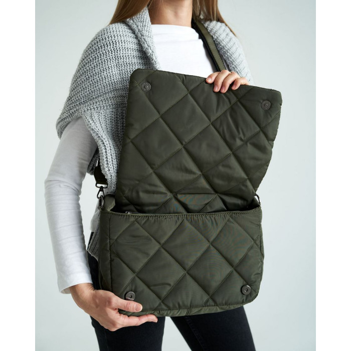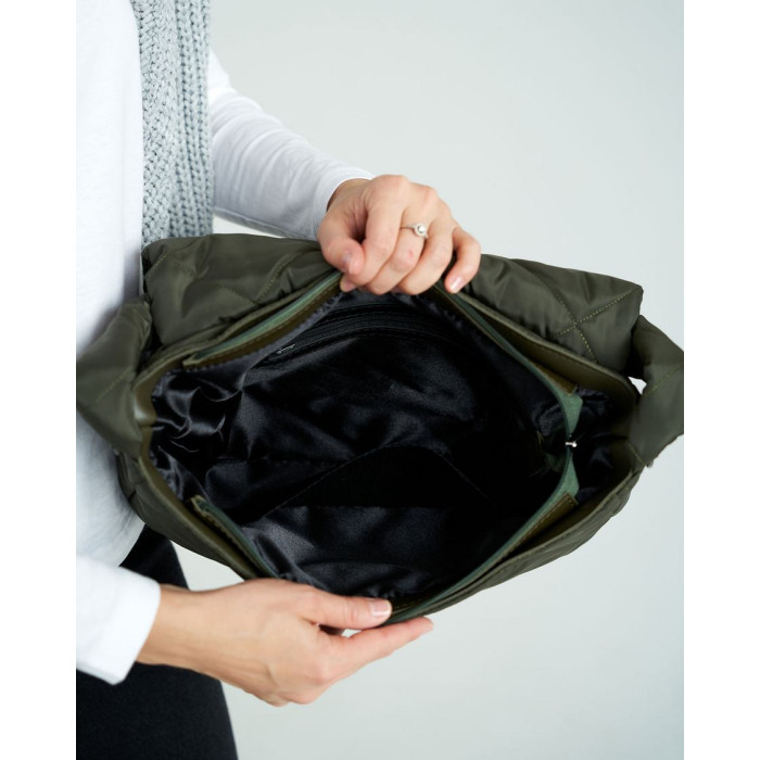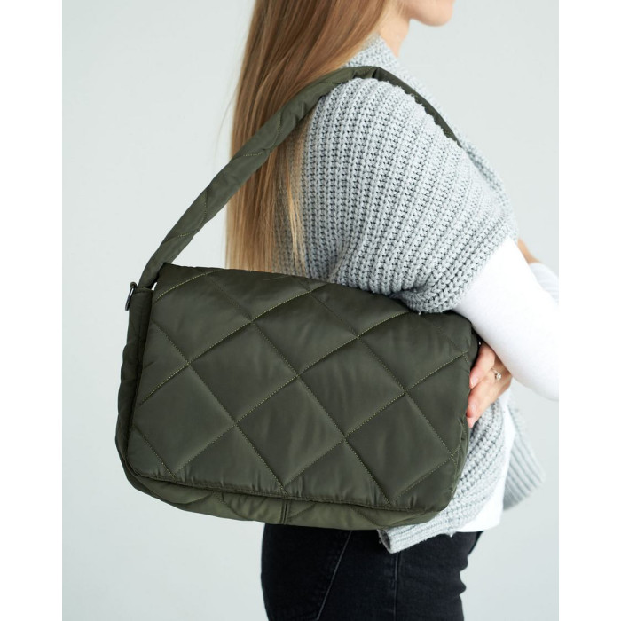 Жіноча нейлонова стьобана сумка 67418 від виробника «Welassie» Україна, колір оливковий, матеріал сумки нейлон. Сумка відкривається за допомогою магніту та застібки-блискавки. Усередині сумка на щільній підкладці і має дві кишені: на застібці та відкриту. Додатково є кишеня на магніті для маленьких предметів. У комплекті є два ремені: вшитий висотою 26 см., (за допомогою якого зручно носити сумку в руці, на згині ліктя) та довгий плечовий ремінь, довжиною 140 см., (за допомогою якого зручно носити через плече).