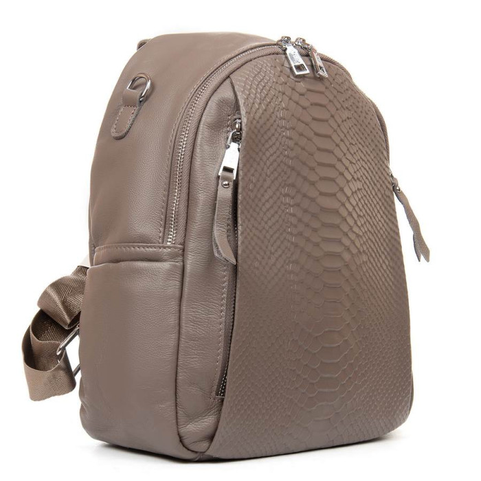 Виготовлена із натуральної м'якої шкіри. Можна носити на плечі широкому ремені. Закривається на блискавку. Усередині знаходиться основне та додаткове відділення, розділене кишенею-перегородкою на блискавці, відкрита кишеня та кишеня на блискавці. Зовні рюкзака на фасаді та зворотній стороні розташовані кишені на блискавці. На торцях рюкзака є маленькі відкриті кишені.