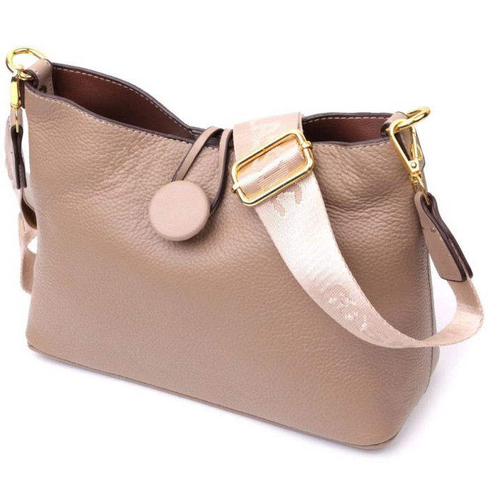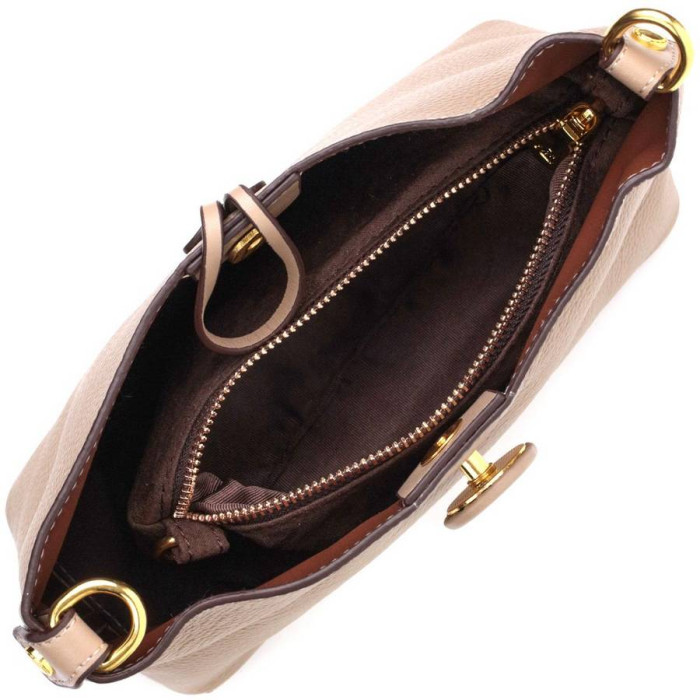 Стильна жіноча сумка без підкладки, з твердим дном і знімною тканинною косметичкою всередині - не залишить байдужою жодну жінку. Виріб пошитий з якісної натуральної шкіри, яка довго носиться і не втрачає свого первісного вигляду. Аксесуар складається з одного основного відділення, всередині якого розташована знімна тканинна косметичка. Носити сумку можна в руці, на плечі та через плече, для цього є шкіряний та текстильний ремені, що знімаються. У виробі використано якісну фурнітуру кольору жовтого золота. Універсальний варіант сумки як на вечір так і як сумочка на кожен день.