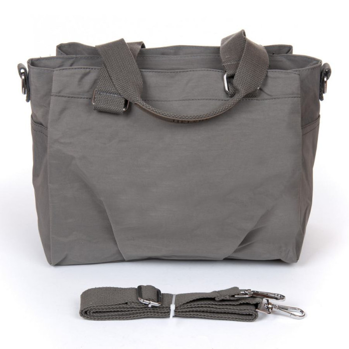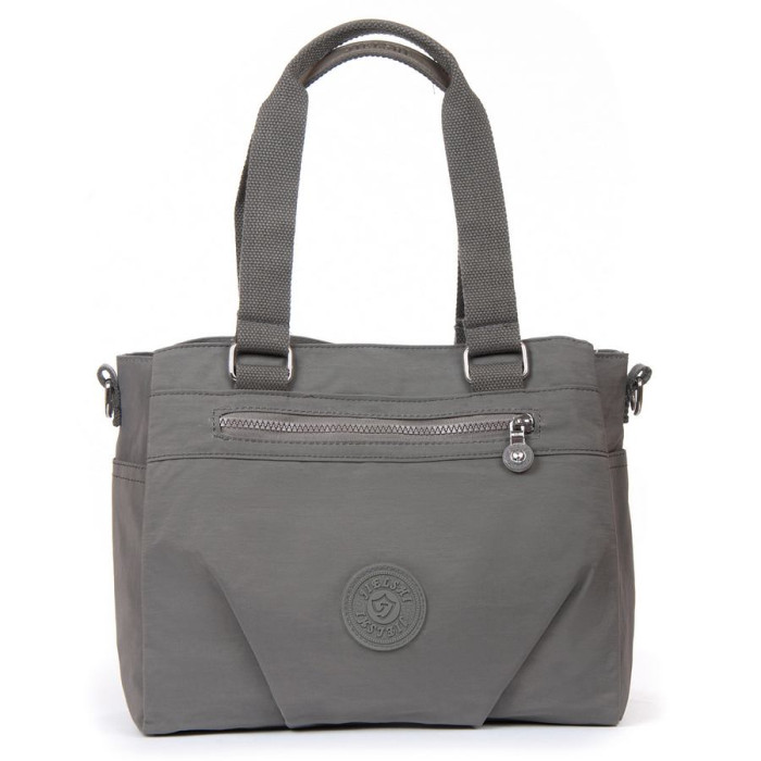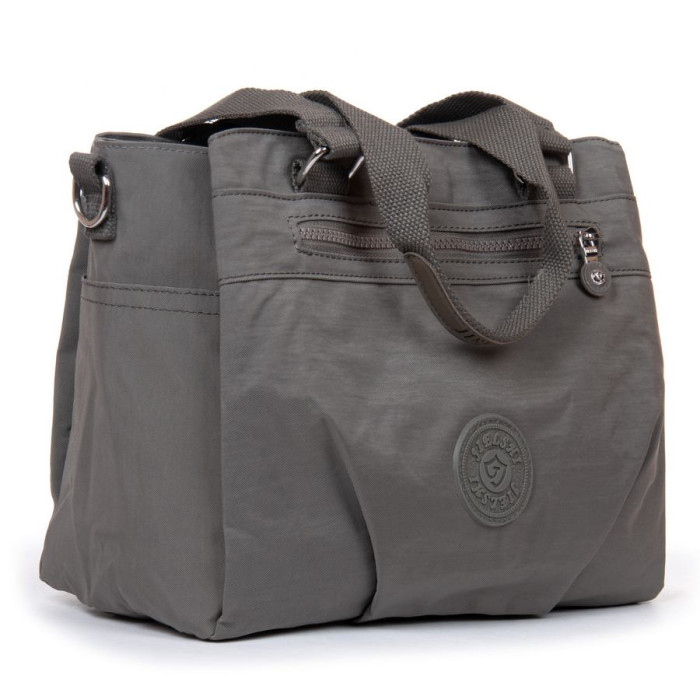 Жіноча сумка Jielshi. Виготовлена з водовідштовхувального текстилю. Три відділення: центральне закривається на блискавку. а бічні магнітні кнопки. Всередині центрального відділення є велика бічна кишеня на блискавці та відкрита подвійна кишеня. На фасаді знаходиться одна містка кишеня на блискавці. А на торцях сумки розташовані відкриті кишені.