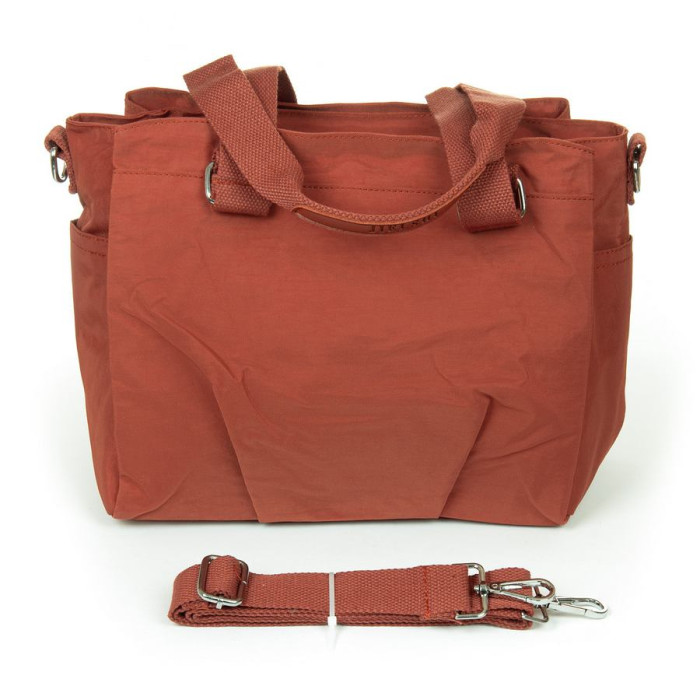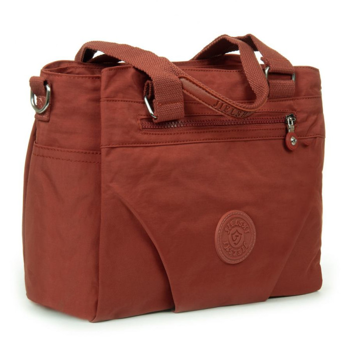Жіноча сумка Jielshi. Виготовлена з водовідштовхувального текстилю. Три відділення: центральне закривається на блискавку. а бічні магнітні кнопки. Всередині центрального відділення є велика бічна кишеня на блискавці та відкрита подвійна кишеня. На фасаді знаходиться одна містка кишеня на блискавці. А на торцях сумки розташовані відкриті кишені.