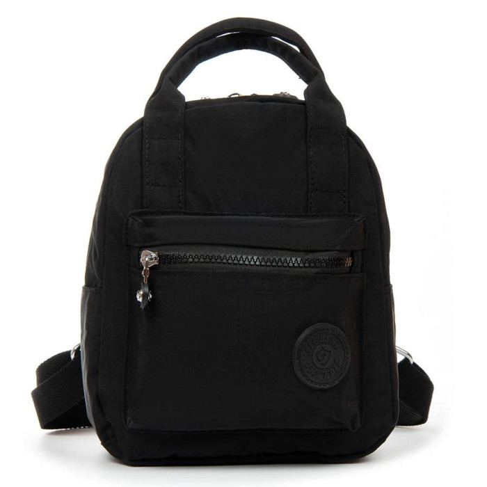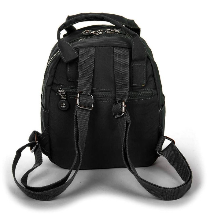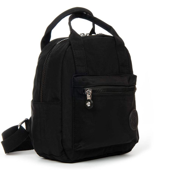 Сумка жіноча - рюкзак. Виготовлена з водовідштовхувального текстилю. Одне відділення закривається на блискавку. Усередині є бічна кишеня на блискавці та відкрита кишеня. На фасаді та зворотному боці рюкзака знаходяться місткі кишені на блискавці. А на торцях є відкриті невеликі кишені.