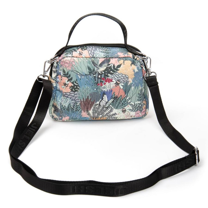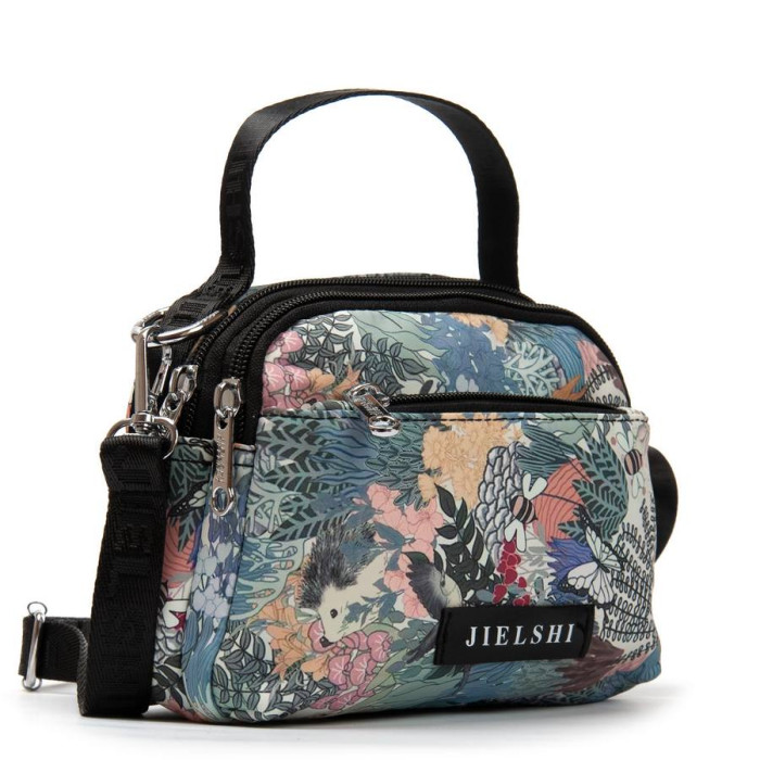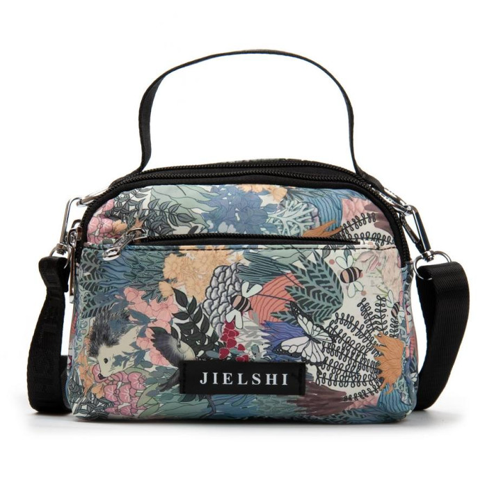 Жіноча сумочка крос боді Jielshi. Виготовлена з водовідштовхувального текстилю. Два відділення, закриваються на блискавці. Всередині є бічна кишеня на блискавці. На фасаді знаходиться велика кишеня на блискавці.