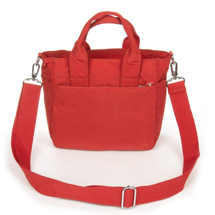 Жіноча сумка. Виготовлена з водовідштовхувального текстилю. Одне відділення закривається на блискавку. Усередині є бічна кишеня на блискавці та відкрита велика кишеня з додатковими відсіками для візитних карток. На фасаді та на звороті знаходяться місткі кишені на блискавці, а на торцях є невеликі відкриті кишені.