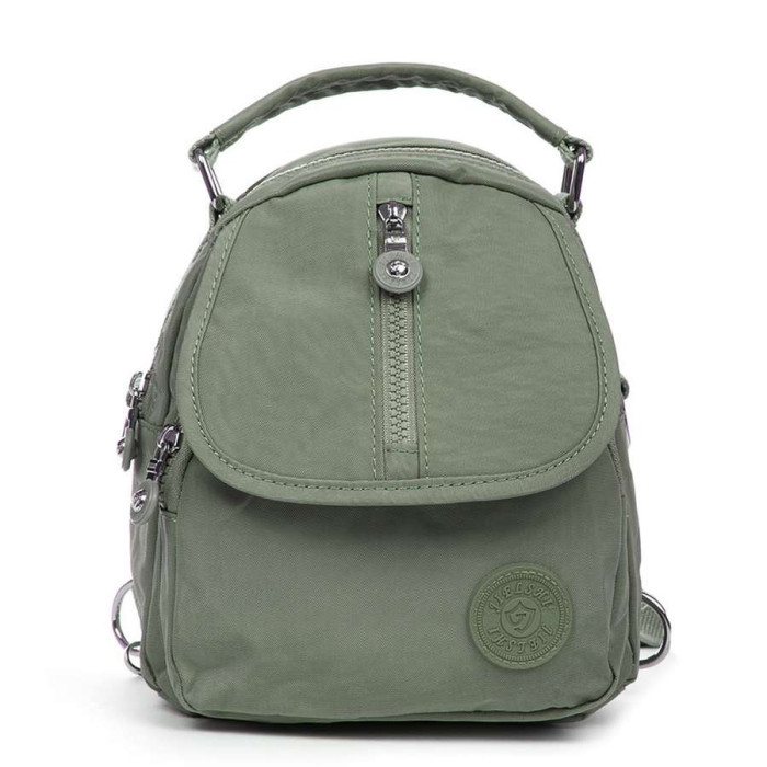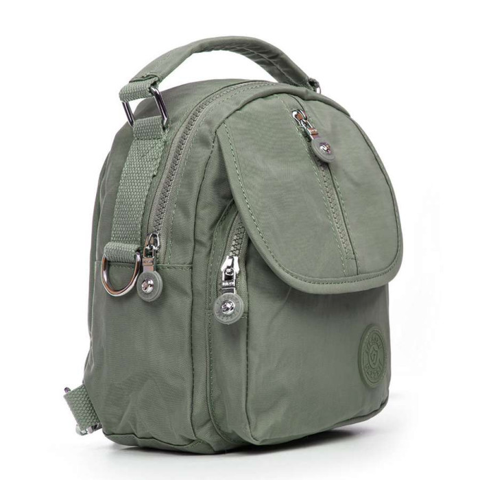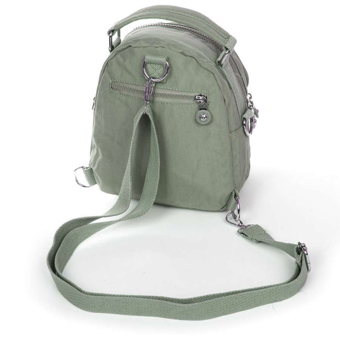 Сумка жіноча - рюкзак. Виготовлена з водовідштовхувального текстилю. Можна носити на ремені або як наплічник. Одне відділення закривається на блискавку. Усередині є бічна кишеня на блискавці і відкрита подвійна кишеня. На фасаді та зворотному боці рюкзака знаходяться місткі кишені на блискавці.