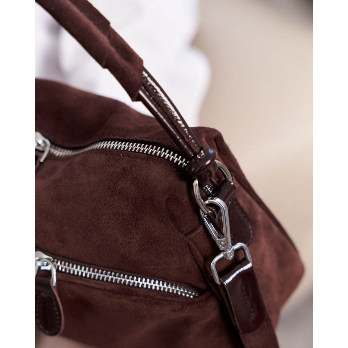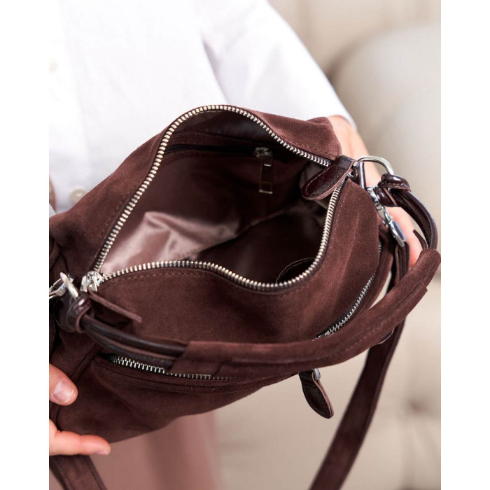 Жіноча сумка K73456, колір моко, матеріал сумки натуральна шкіра, замша. Сумка відкривається за допомогою блискавки. Усередині сумка має одну відкриту кишеню та кишеню на блискавці. Зовні є кишеня для дрібних речей.