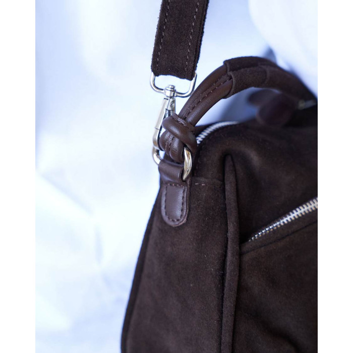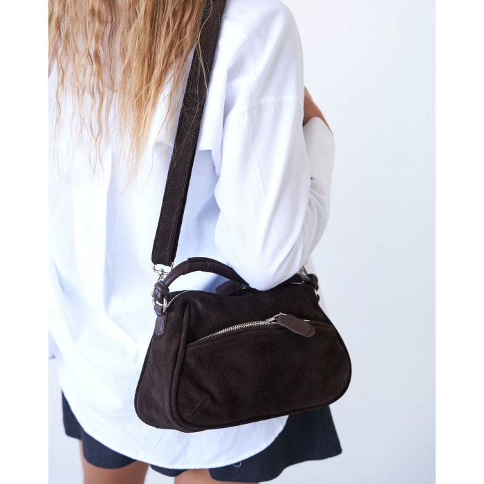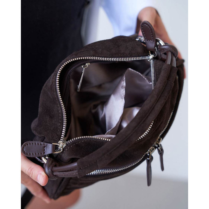 Жіноча сумка K73455, колір коричневий, матеріал сумки натуральна шкіра, замша. Сумка відкривається за допомогою блискавки. Усередині сумка має одну відкриту кишеню та кишеню на блискавці. Зовні є кишеня для дрібних речей.