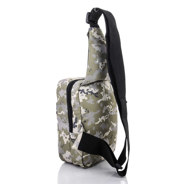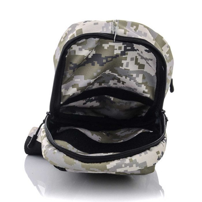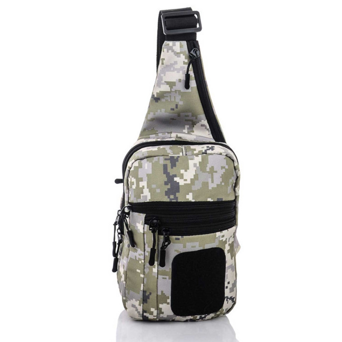Сумка-кобура наплічна 70701 з липучкою всередині для прихованого носіння пістолета. Тактична сумка через плече виконана з щільного, якісного матеріалу, Колір Піксель. Всередині більшого відділу з одного боку вшита липучка розмірами 17х7.5 см. для кріплення кобури, ін.; з другої сторони пришита гумка. Зовні сумка має 5 кишень на блискавці: 3 кишені спереду, 1 кишеня у верхній частині, 1 кишеня з задньої частини. Зовні сумка має нашиту липучку 8х10см.для шевронів, патчів ін. Сумку зручно носити через плече. Плечовий ремінь регулюється під різну довжину.