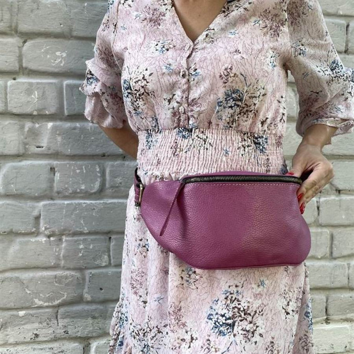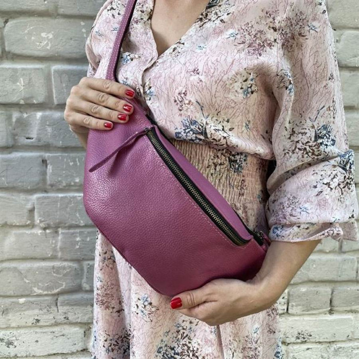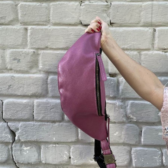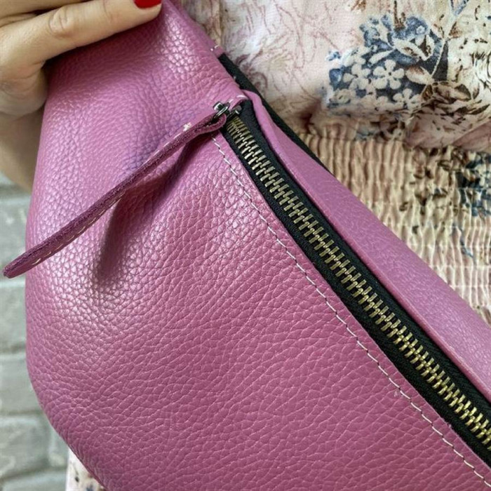 Жіноча бананка, шкіряна сумка на пояс, поясна сумка TARWA 36-160 в кольорі Маракуя. Бананка виготовлена повністю зі шкіри флотар, усередині шкіряна бахрома. Два зовнішні відділи на блискавках, усередині великого відділу - внутрішня кишеня