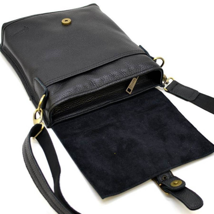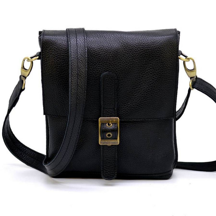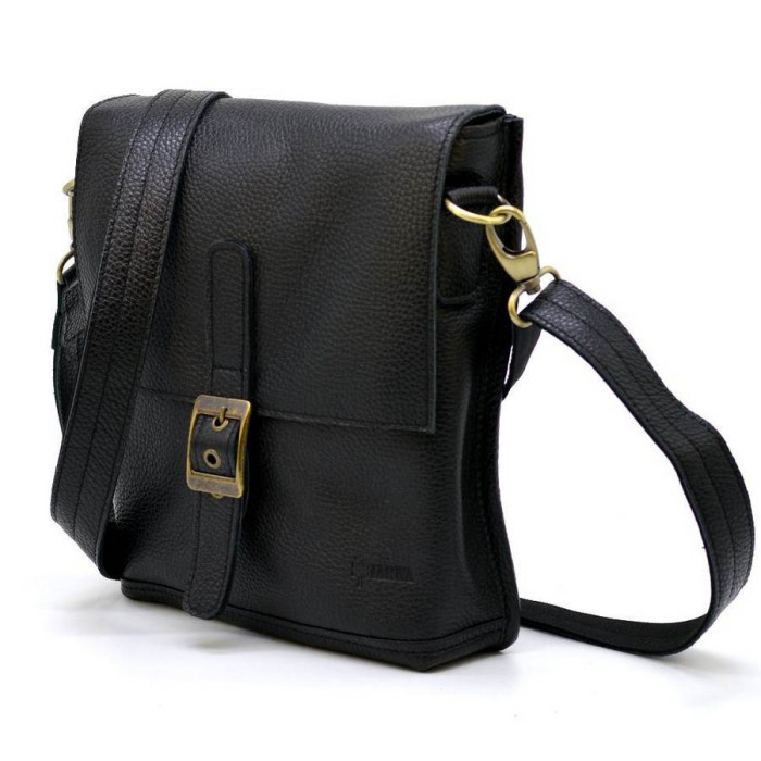 Чоловіча шкіряна сумка-месенджер з клапаном, з натуральної телячої шкіри FA-7157-3md, від українського бренду TARWA. Може вміщувати планшет, блокнот, формат А5. Виріб на одне відділення з блискавкою і шкіряним клапаном, з ремінцем, фальш-замочком і магнітною кнопкою. Усередині аксесуара розташовуються два тканинних накладних відкритих кишені для телефону і документів, і третя кишеня виразний з блискавкою. На задній стороні виробу також кишеня з блискавкою. На лицьовій стороні сумки є містка відкрита плоска кишеня, практично на всю поверхню сумки, який прикривається клапаном. Мессенджер оснащений шкіряним, незнімним, який регулюється по довжині ремінцем для комфортної носіння на плечі.