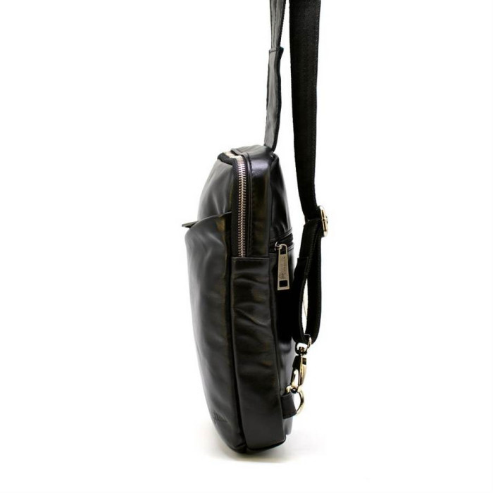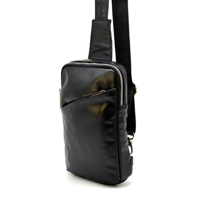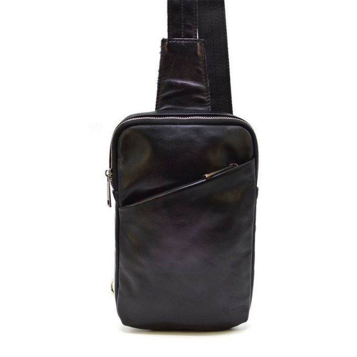 Стильний міні-рюкзак чоловічий на одну шлею GA-0204-4lx TARWA, з натуральної шкіри. Зручний і практичний аксесуар, підходить для щоденного використання. Може вміщувати документи формату А5. Виріб на одне відділення, з тканинним підкладів. Усередині є врізна кишеня для документів або інших важливих речей. Лицьову сторону рюкзака доповнює косою кишені на блискавки. На задній стороні сумки також є врізна кишеня. Рюкзак оснащений шкіряною шлеєю з текстильної основою, що запобіжить її деформацію. Ремінець регулюється по довжині.