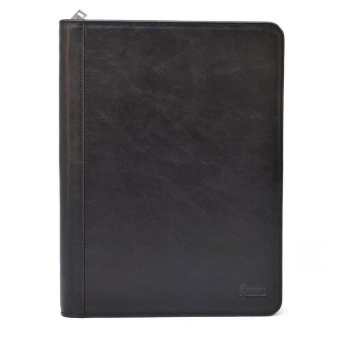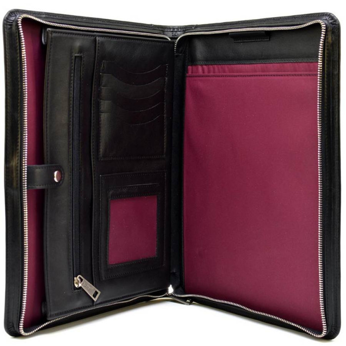 Шкіряна папка на блискавці для документів А4+ GA-1296-4lx від українського виробника TARWA, у чорному кольорі. Папка вміщує документи А4 в два спеціальних відсіки для паперів А4, один з яких дуже місткий і застібається на хлястик з кнопкою, також документи можна вміщати просто "всередину" папки, що закривається. Дана модель має: 5 слотів для пластикових карток, виготовлена папка з високоякісної шкіри, всередині папки якісний текстильний підклад у бордовому кольорі. Стильний аксесуар ідеально підійде для роботи в офісі, відрядження.
