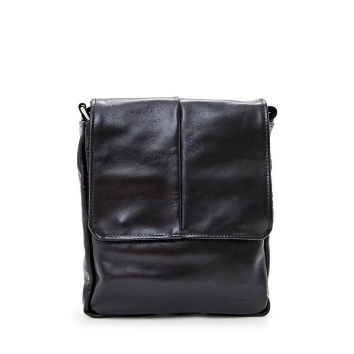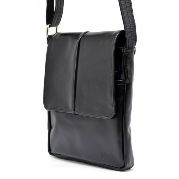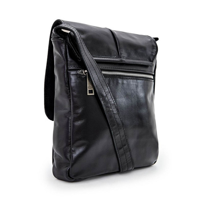 Чоловіча сумка через плече з натуральної м'якої телячої шкіри, чорного кольору GA-1301-4lx від українського бренду TARWA. Незважаючи на невеликі розміри, модель може вміщати документи формату А5, планшет. Виріб на одне відділення, що застібається на блискавку, і зверху накривається шкіряним клапаном, з магнітною кнопкою. Усередині розташовуються кишені: дві відкритих кишені для телефону і портмоне, а також одна врізна на блискавці для дрібних предметів. На лицьовій стороні сумки, під клапаном, є дві кишені з блискавками. На задній стороні є врізна кишеня на блискавки. Аксесуар зручно носити на плечі, завдяки регулюється плечевого шкіряного ременя.