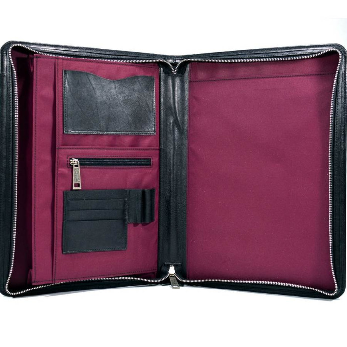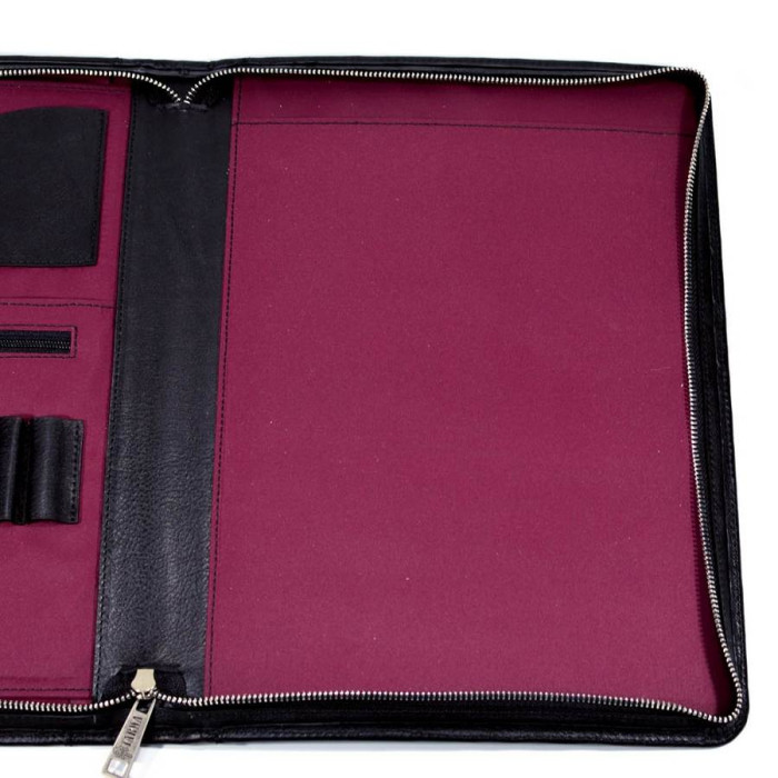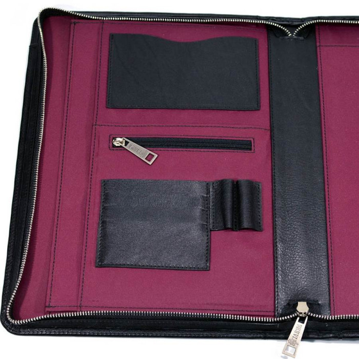 Деловая папка с ручкой, для документів A4 GA-1404-4lx, из натуральной телячьей кожи черного цвета, от украинского бренда TARWA. Красивая и практичная и мега-функциональная модель, подчеркнет статус своего владельца. Аксессуар наделен шкіраной ручкой и застегивается при помощи молнии, с трех сторон. Внутри: четыре отделения-кармана для бумаг, один врезной карман с молнией, один открытый тканевый карман, один шкіраный открытый, а также четыре кармана-слота под пластиковые карты или визитки и два держателя для ручек. Папка внутри полностью обшита прочным тканевым підкладкаом. На лицевой стороне аксессуара располагается косой, плоский карман, который также придает своеобразную изюминку изделию.