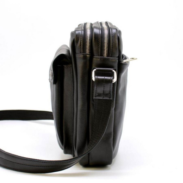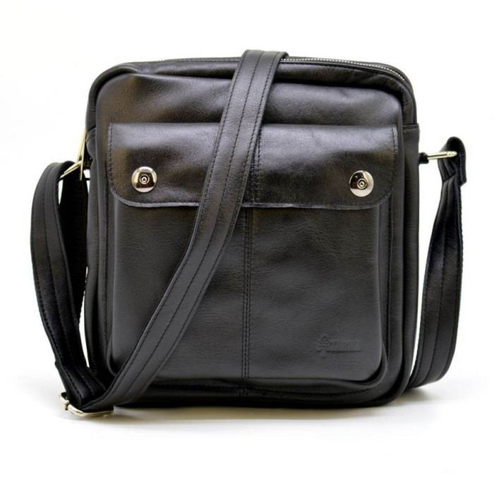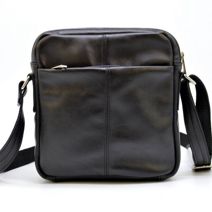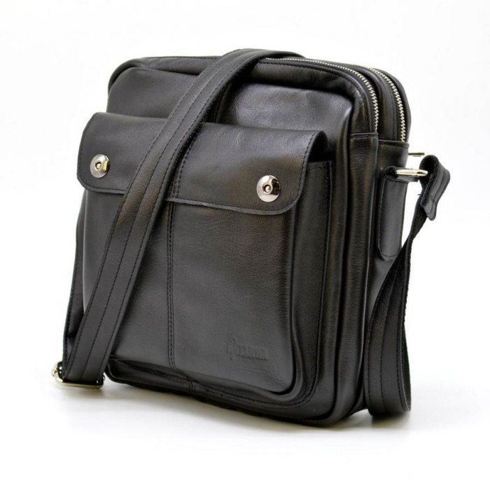 Чоловічий месенджер з натуральної телячої шкіри GA-60122-3md від українського бренду TARWA. Універсальна сумка для повсякденного носіння. Вміщує в себе планшет, портмоне, документи формату А5 і інші необхідні предмети. Виріб состот з двох відділень, застібаються на окремі блискавки. Усередині великого по-розміром відділення є два відкритих кишеньки для дрібних предметів, і врізна кишеня на блискавки. Дизайн лицьової частини аксесуара доповнює об'ємний накладна кишеня з клапаном на металевих кнопках. На задній стороні сумки є врізна кишеня на блискавки. Виріб оснащений шкіряним плечевим ременем, завдяки якому, носити сумку буде дуже зручно.