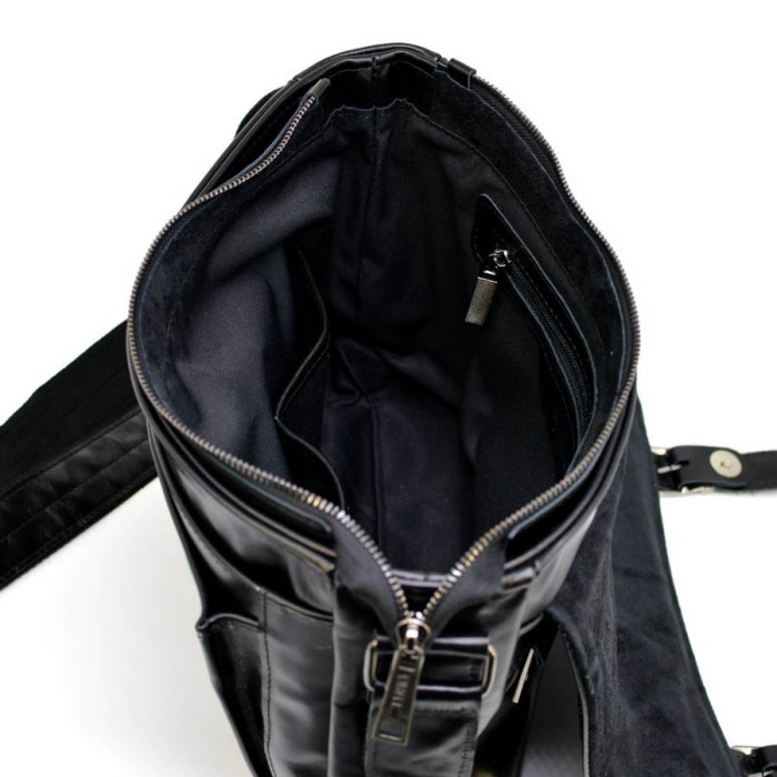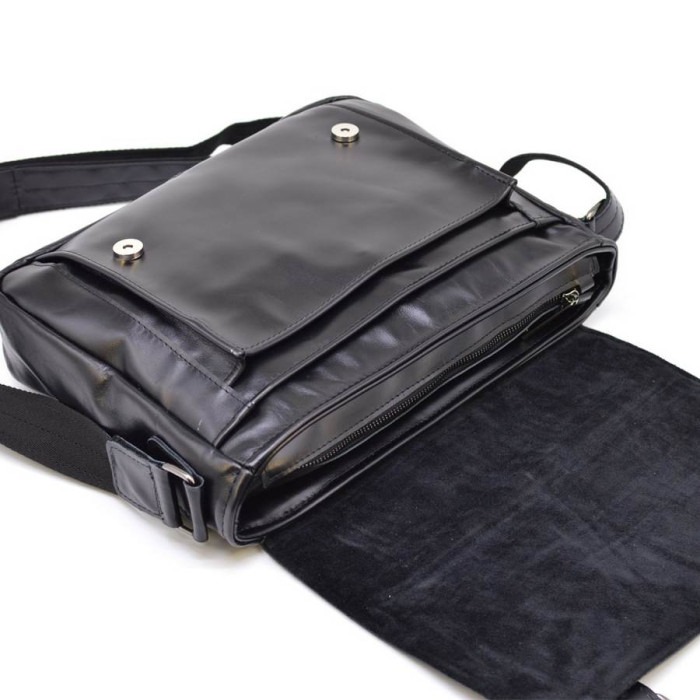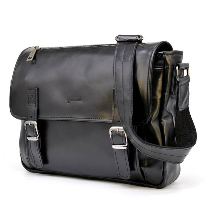 Чоловіча сумка через плече, з натуральної телячої шкіри GA-6046-3md, від українського бренду TARWA. Модель вміщає документи формату А4. Усередині вироби один кишені на блискавки, три кишені поменше для портмоне і телефону. Усередині міцний тканинний підкладка. На лицьовій стороні шкіряний клапан на фальш-пряжках з магнітами і з кишенею на блискавці. На задній стороні сумки також мається кишені на блискавки, під клапаном два каскадних кишені на магнітних кнопках. Сумка оснащена шкіряним ремнем через плече з регулюванням довжини, може використовуватися як крос-боді, наплічна сумка, повсякденна сумка.