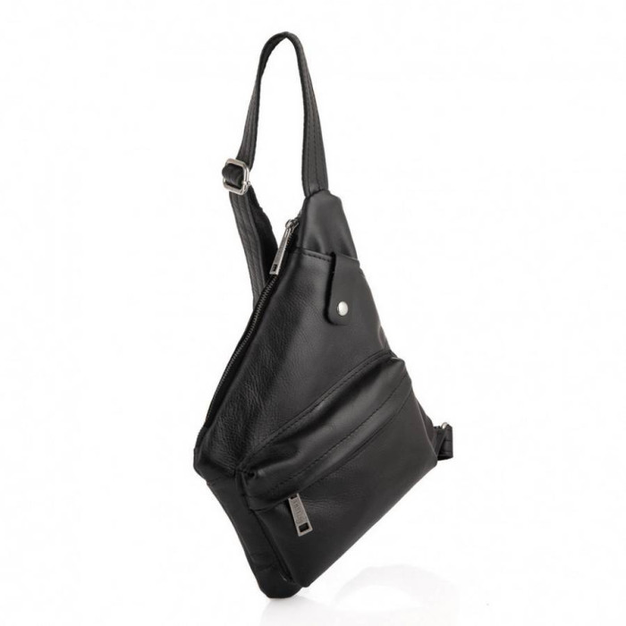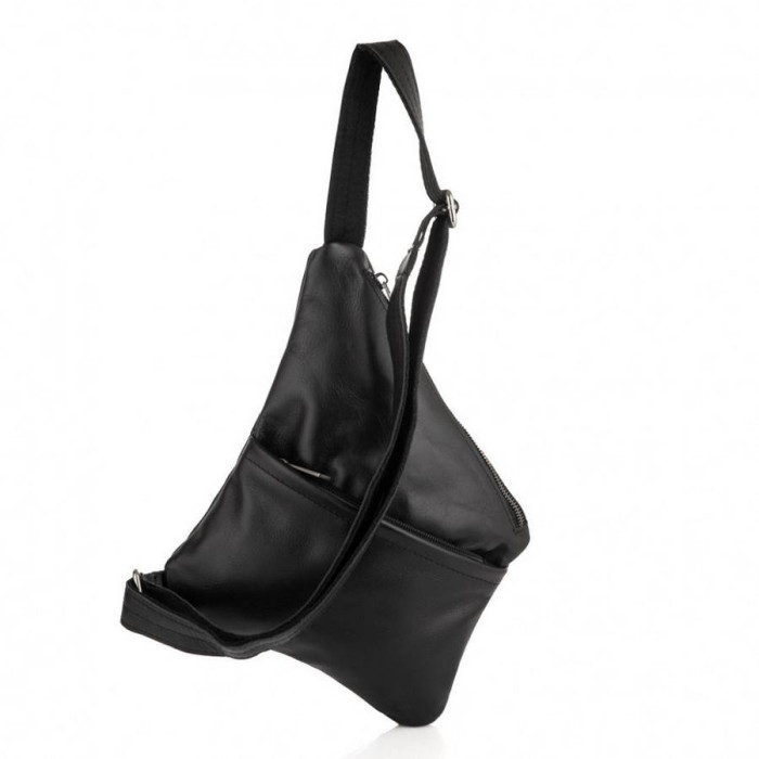 Чоловіча сумка слінг чи рюкзак через плече GA-6501-3md бренд TARWA. Аксесуар незвичайної форми, і максимальною функціональністю при носінні. Буде корисна у поїздках та подорожах. Виріб виготовлено повністю з натуральної шкіри, чорна наппа. Блискавки – темний нікель.