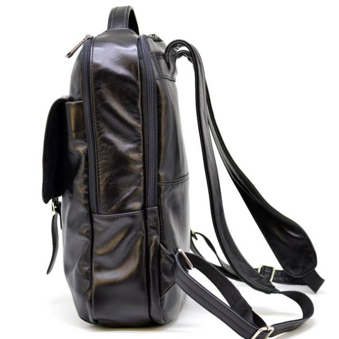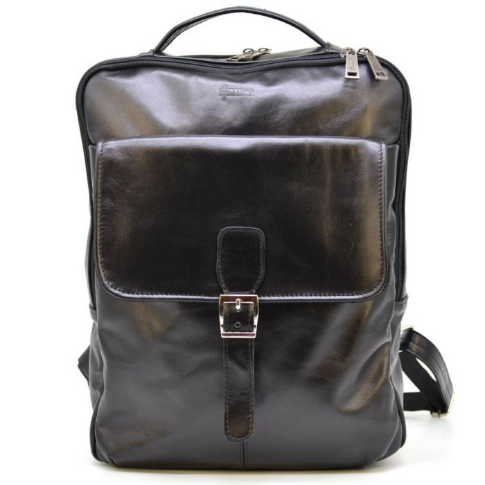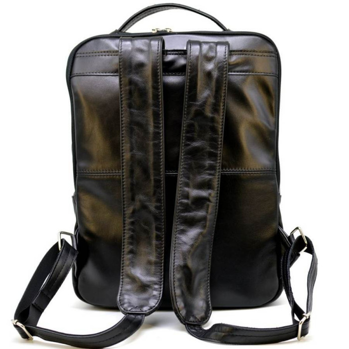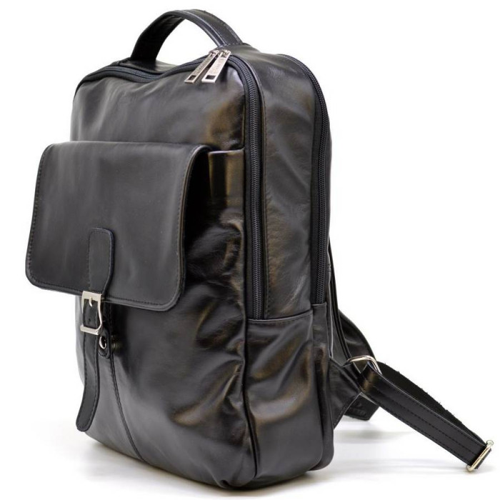 Міський рюкзак для чоловіків TARWA GA-7280-3md з натуральної телячої шкіри, чорного кольору. Зручний і практичний аксесуар, прекрасне рішення для повсякденного носіння. Рюкзак складається з двох відділень, які закриваються кожне на окрему блискавку. В одному з відділень є м'який кишеню-відсік на липучці, для зберігання ноутбука до 14 "або планшета, хоча в основному відділенні можна розмістити ноутбук розміром 15". В іншому відділенні є врізна кишеня на блискавці і дві відкритих для смартфона, портмоне, і ключів. На лицьовій стороні розташовується кишеню, який застібається за допомогою шкіряного клапана з магнітною кнопкою. Щільний тканинний підкладка і надійна, брендована фурнітура доповнюють даний аксесуар. Широкі шкіряні шлейки допоможуть розподілити навантаження по всій спині, що забезпечить Вам комфортне використання рюкзака.