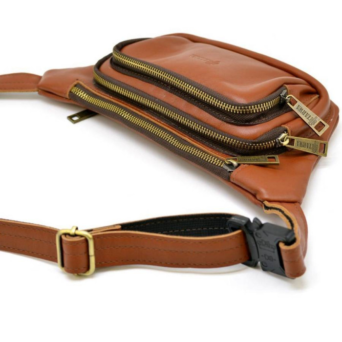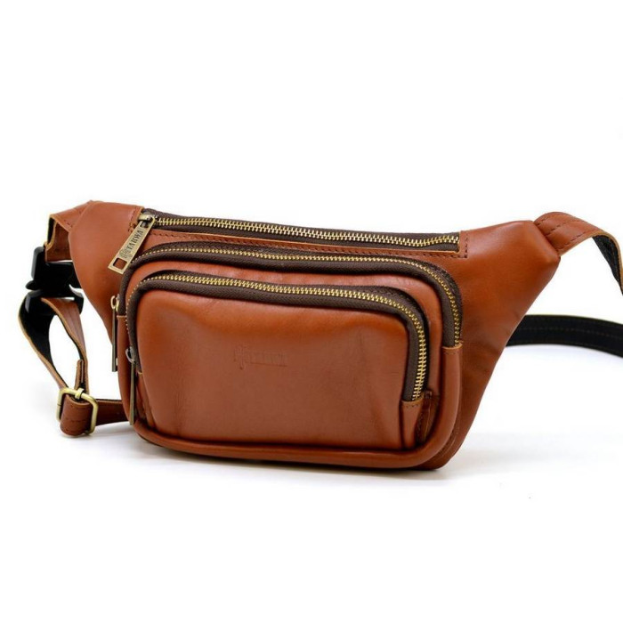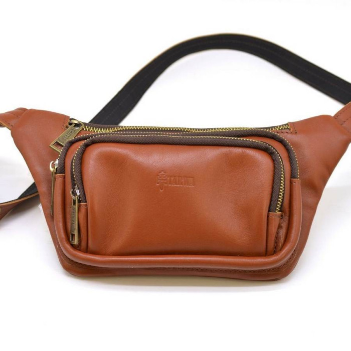Дуже зручна і функціональна напоясна сумка GB-8179-3md бренду TARWA, з натуральної телячої шкіри, рудувато-коричнева. Виріб має основний відділ з кишенькою всередині. Також два об'ємних кишені, прямокутної форми, з блискавкою для зберігання телефону, гаманця, документів. На задній стороні є врізна кишеня з блискавкою. Модель має логотип бренду на лицьовій стороні. Ремінець виконаний зі шкіри і регулюється по довжині. Фурнітура металева, колір - бронза. Аксесуар досить компактний, хоча і місткий. Модель припаде до смаку не тільки чоловікам, але жінкам.