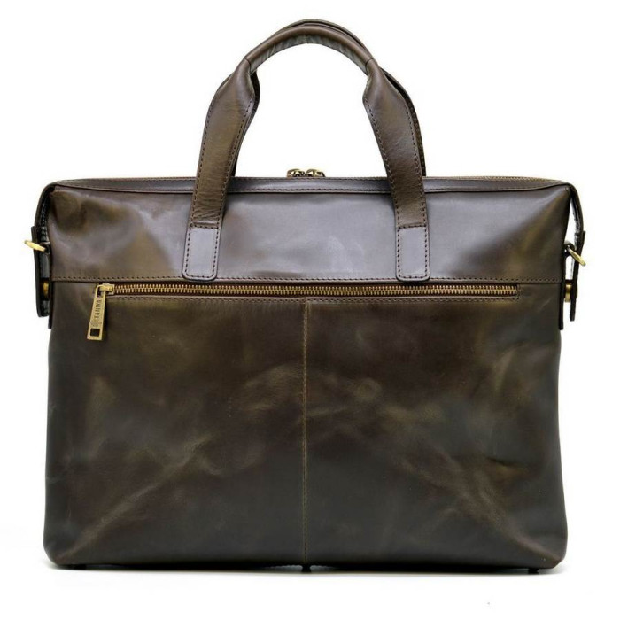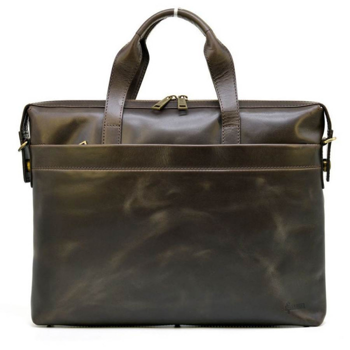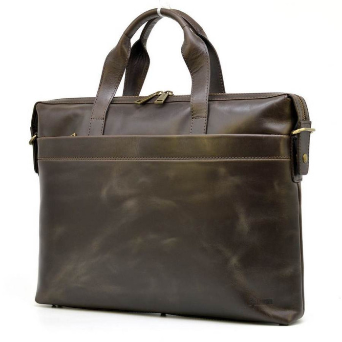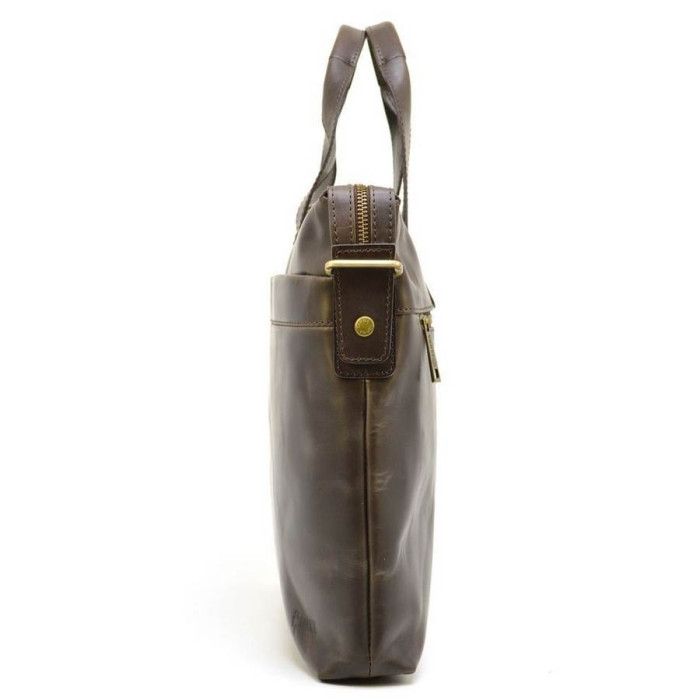 Тонка і практична сумка-портфель GC-0042-4lx застосуємо для ноутбука 15 "і документів. Виготовлена з ексклюзивною шкіри, коричневого кольору. Вона складається з: 1 основного відділення та кишені-перегородку, застібається на блискавку, яка ділить сумку на 2 окремих відсіку. передбачено прорізна кишеня на блискавки і спеціальні кишені-органайзери, виконані зі шкіри для смартфона, зарядок і інших дрібниць. з лицьової частини аксесуара розташована велика кишеня на металевій блискавці. на тильній стороні - внутрішня кишеня на блискавці. Портфель застібається на блискавку, яка застібається по краях на кнопки. Дно портфеля оснащено п'ятьма маленькими металевими ніжками. В комплекті є регульований текстильний ремінь з шкіряними елементами через плече.
